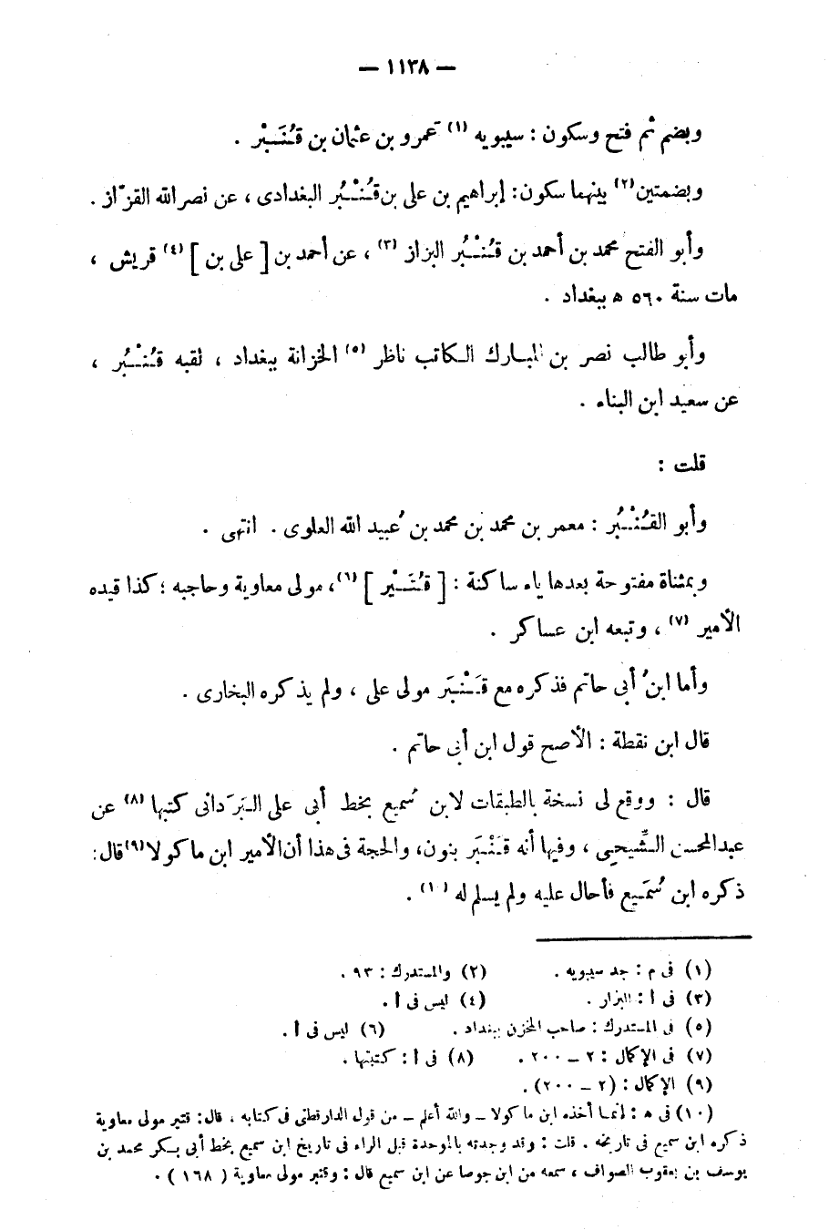 قال: ووقع لي نسخة بالطبقات لابن سميع بخط أبي علي البرداني كتبها عن عبد المحسن الشيحي، وفيها أنه قنبر بنون، والحجة في هذا أن الأمير ابن ماكولا قال: ذكره ابن سميع فأحال عليه ولم يسلم له.