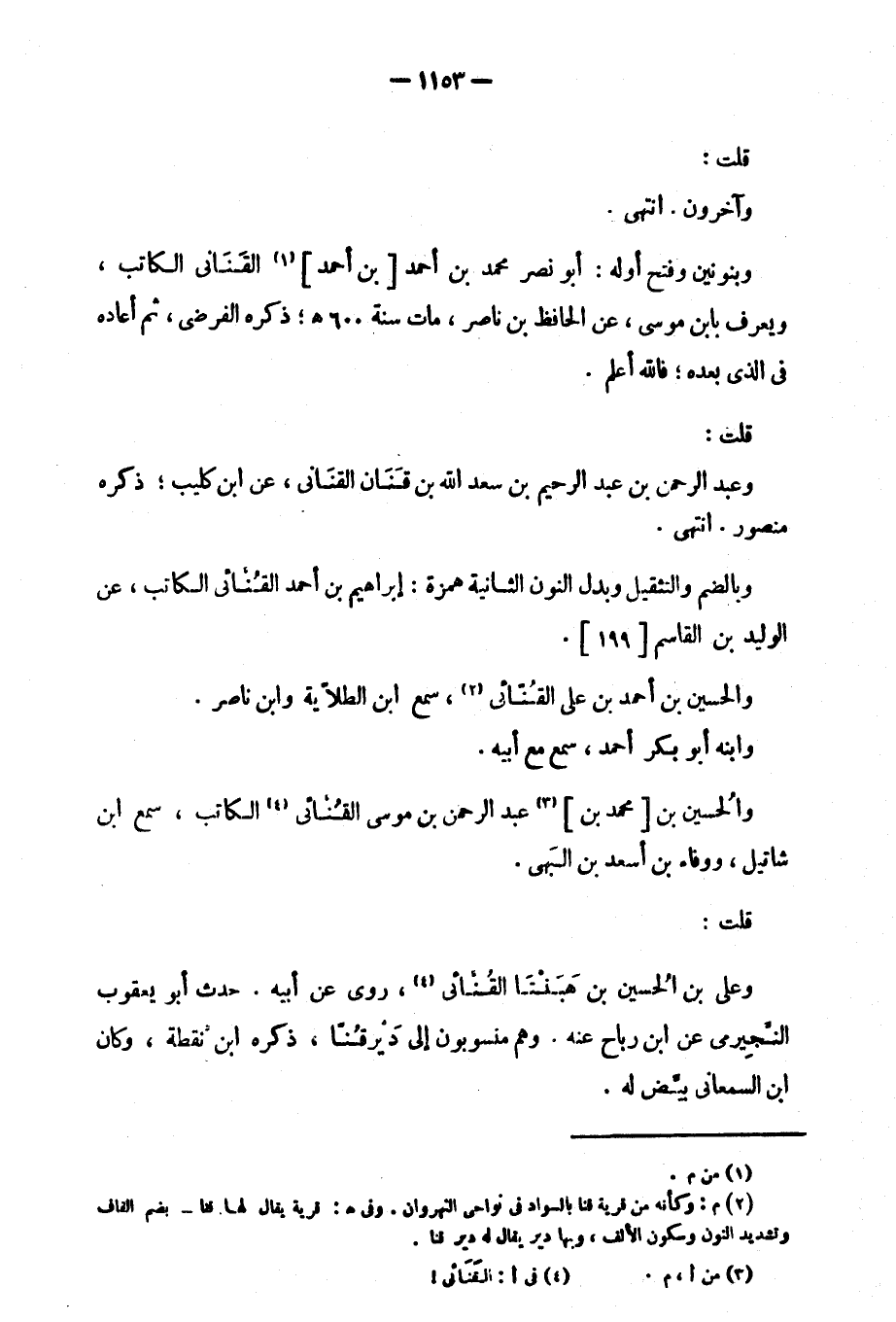 وبنونبن وفتح أوله: أبو نصر محمد بن أحمد بن أحمد القناني الكاتب، ويعرف بابن موسى، عن الحافظ بن ناصر، مات سنة 600؛ ذكره الفرضي، ثم أعاده في الذي بعده؛ فالله أعلم.