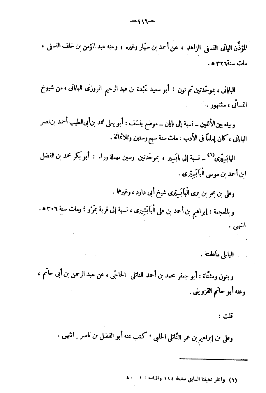 وبياء بَيْنَ الألفين، نسبة إِلَى بابان، موضع بنسَف: أبو يعلى محمد بن أبي الطيب أحمد بن نصر الباباني، كَانَ إماماً فِي الأدب. مات سنة سبع وستين وثلاثمِئَة.