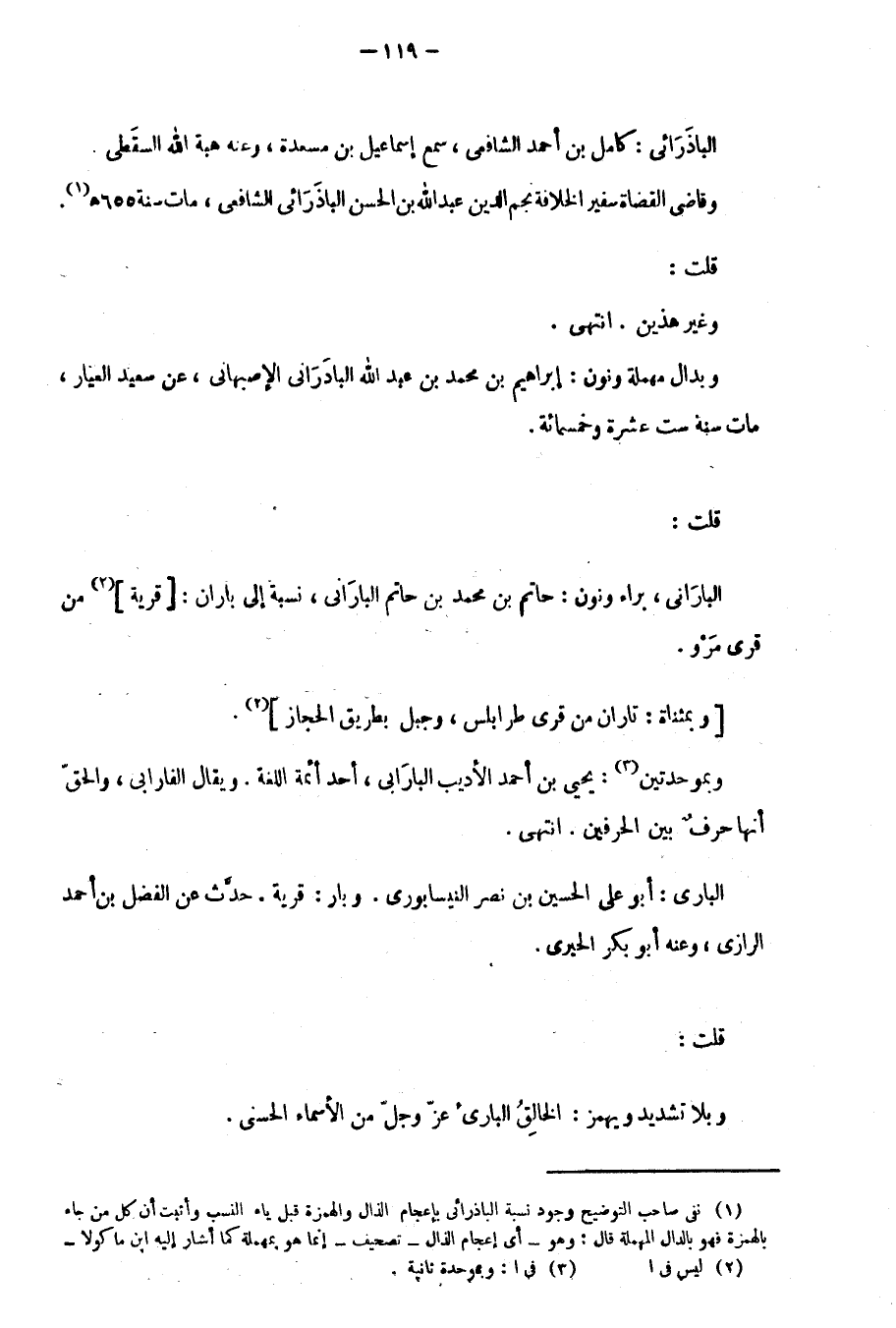 قلت: البارَني، براء ونون: حاتم بن محمد بن حاتم البارَاني، نسبة إِلَى باران: قرية من قرى مَرْو.