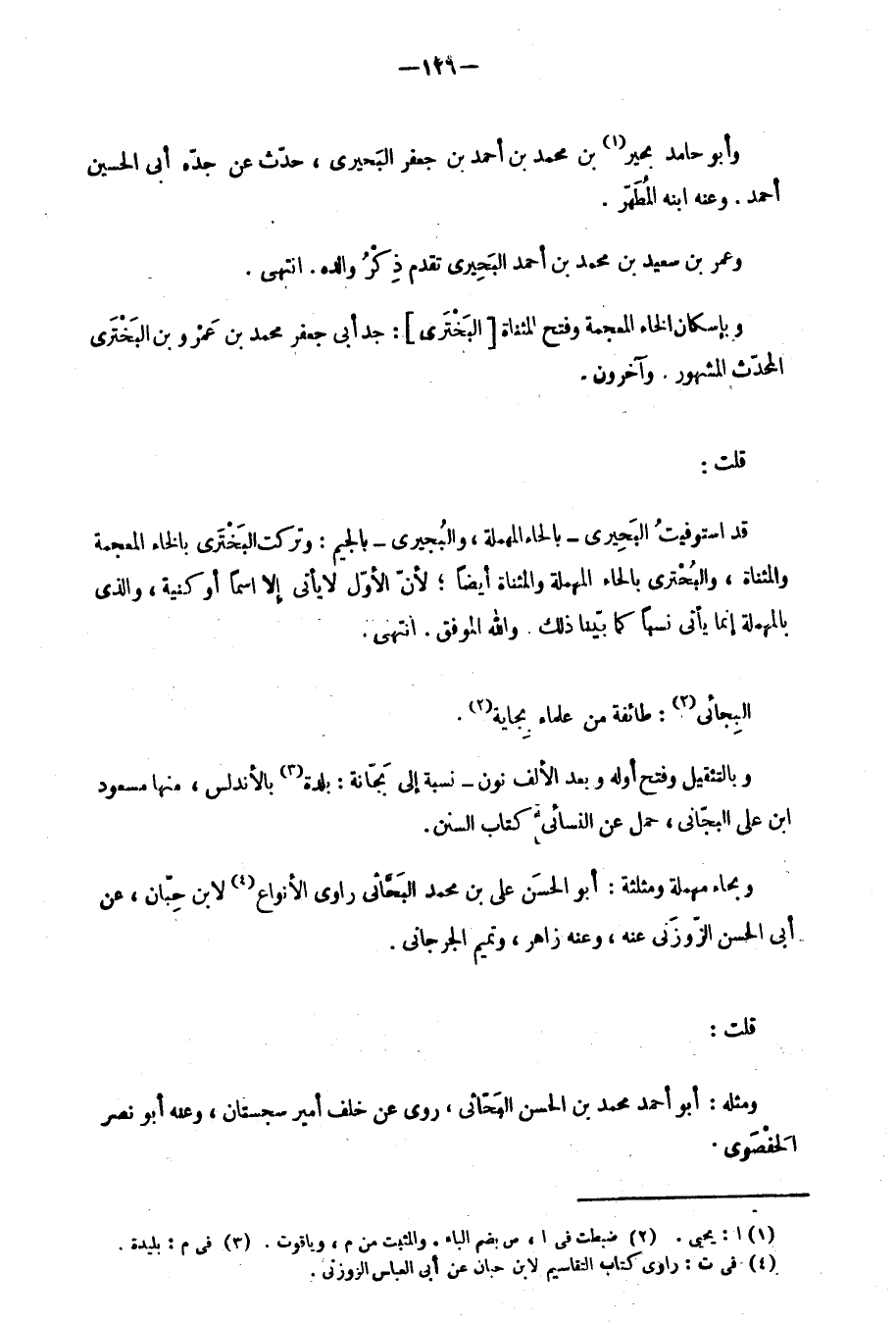 قلت: قد استوفيتُ البَحِيري، بالحاء المهملة، والبُجيري، بالجيم: وتركت البَخْتَري بالخاء المعجمة والمثناة، والبُحْتري بالحاء المهملة والمثناة أيضاً؛ لأنّ الأوّل لا يأتي إِلاَّ اسماً أو كنية، والذي المهملة إنما يأتي نسباً كما بيّنا ذَلِكَ والله الموفق. انتهى.