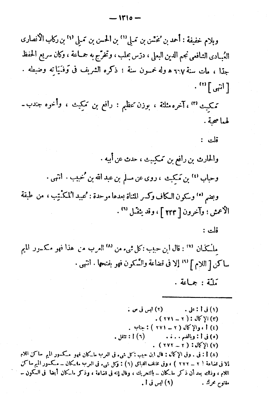 وبلام خفيفة: أحمد بن مُحسِّن بن ملي بن الحسن بن ملي بن ركاب الأنصاري العُبادي الشافعي نجم الدين البعلي، درّس بحلب، وتخرّج به جماعة، وكان سريع الحفظ جدّاً، مات سنة 667 هـ وله خمسون سنة؛ ذكره الشريف في وفياته وضبطه. انتهى.