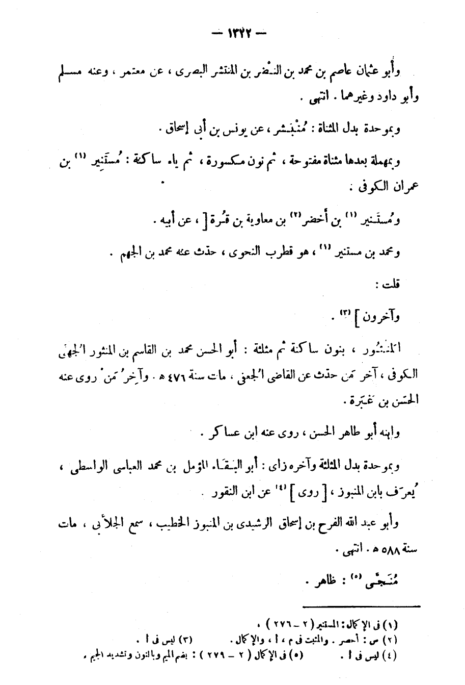 وبمهملة بعدها مثناة مفتوحة، ثم نون مكسورة، ثم ياء ساكنة: مًستنير بن عمران الكوفي.