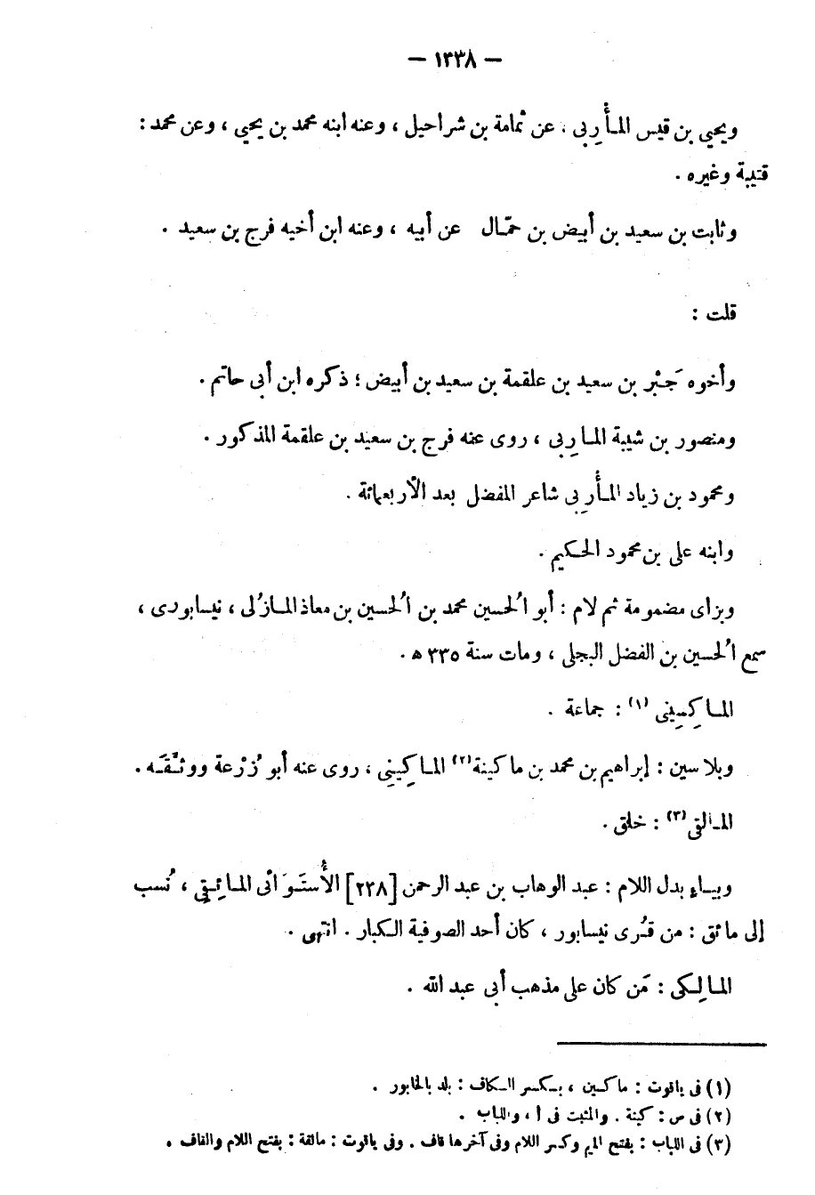 وبياء بدل اللام: عبد الوهاب بن عبد الرحمن 238 الاستوائي المائقي، نُسب إلى مائق: من قُرى نيسابور، كان أحد الصوفية الكبار. انتهى.