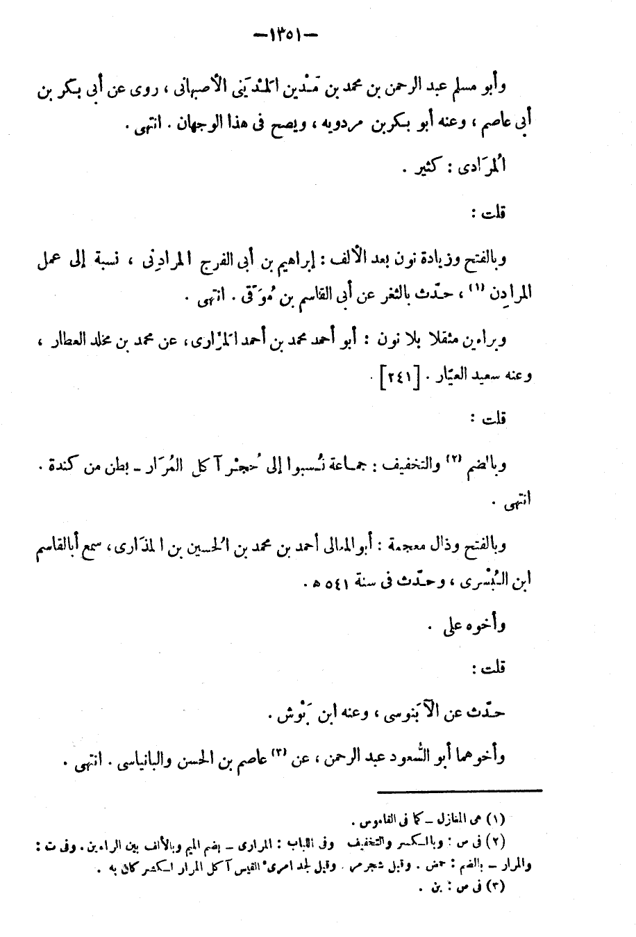 قلت: وبالفتح وزيادة نون بعد الألف: إبراهيم بن أبي الفرج المرادني، نسبة إلى عمل المرادن، حدّث بالثغر عن أبي القاسم بن مُوّقى. انتهى.
