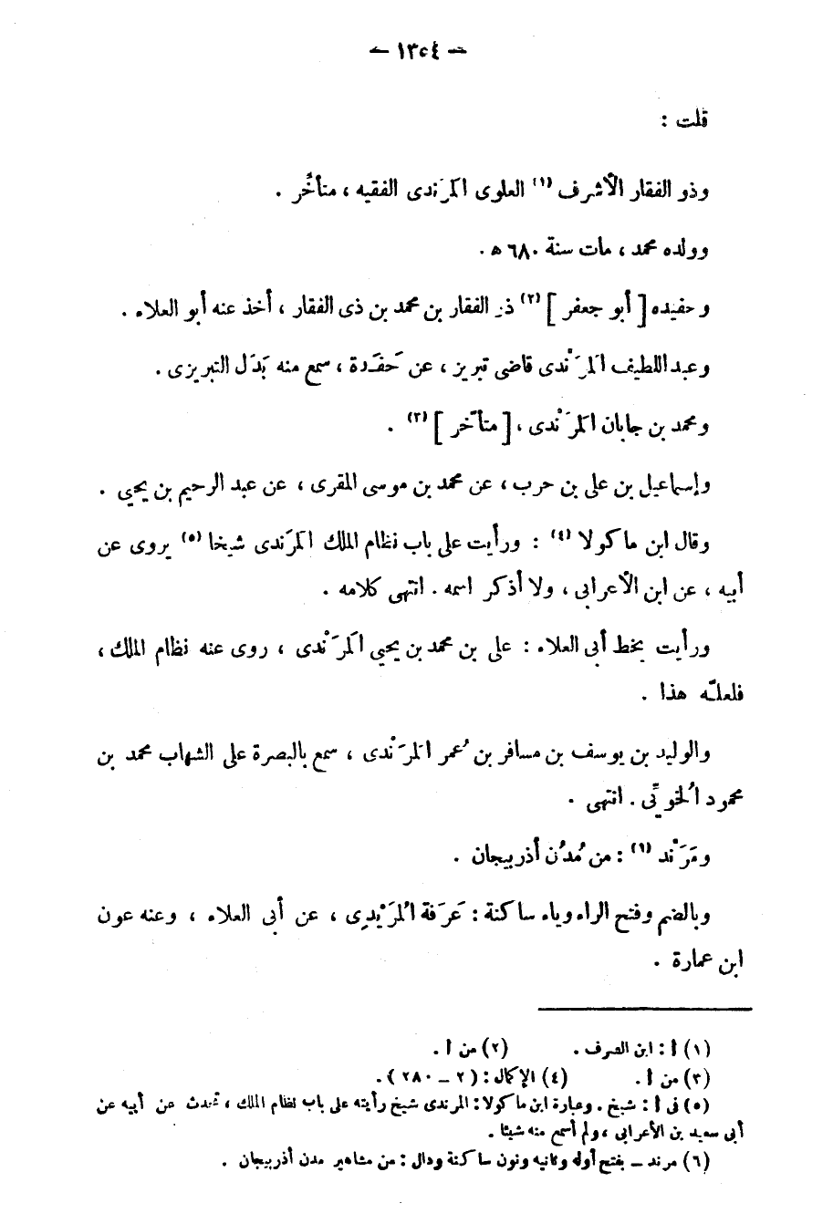 وقال ابن ماكولا: ورأيت على باب نظام الملك المرَندي شيخاً يروي عن أبيه، عن ابن الأعرابي، ولا أذكر اسمه. انتهى كلامه.