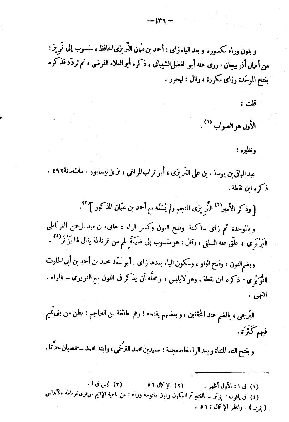 وبنون وراء مكسورة وبعد الياء زاي: أحمد بن عثمان النَّريزي الحافظ، منسوب إِلَى نَرِيز: من أعمال أذربيجان. روى عنه أبو الفضل الشيباني، ذكره أبو العلاء الفرضي، ثُمَّ تردّد فذكره بفتح الموحّدة وزاي مكررة، وقال: ليحرر.