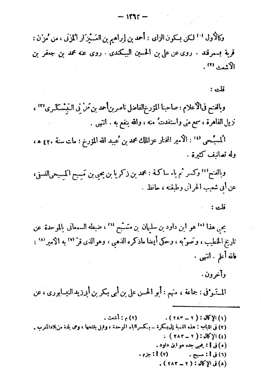قلت: يحيى هذا هو ابن داود بن سليمان بن مسبَّح، ضبطه السمعاني بالموحدة عن تاريخ الخطيب، وصوّبه، وحكى أيضاً ما ذكره الذهبي وهو الذي قرّ به الأمير؛ فالله أعلم انتهى.