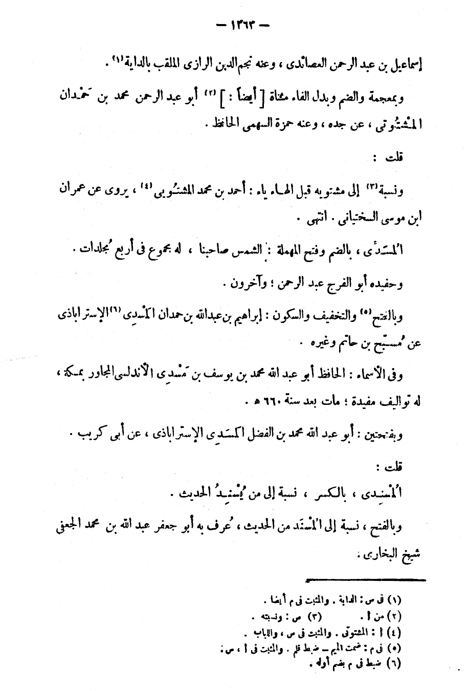 وبالفتح نسبة إلى المسند من الحديث، عُرف به أبو جعفر عبد الله بن محمد الجعفي شيخ البخاري.