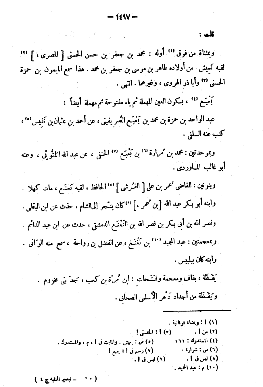 قلت: وبمثناة من فوق أوله: محمد بن جعفر بن حسن الحسني المصري، لقبه تعيش من أولاده طاهر بن موسى بن جعفر بن محمد. هذا سمع الميمون بن حمزة الحسني وأباذر الهروي، وغيرهما. انتهى.