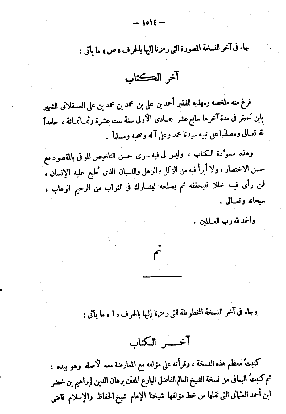 فرغ منه ملخصه ومهذبه الفقير أحمد بن علي بن محمد ين علي العسقلاني الشهير بابن حجر قي مدة آخرها سابع عشر جمادى سنة عشر وثمانمِئَة، حامدا لله تعالى ومصليا على نبيه سيدنا محمد وعلى آله وصحبه ومسلما.