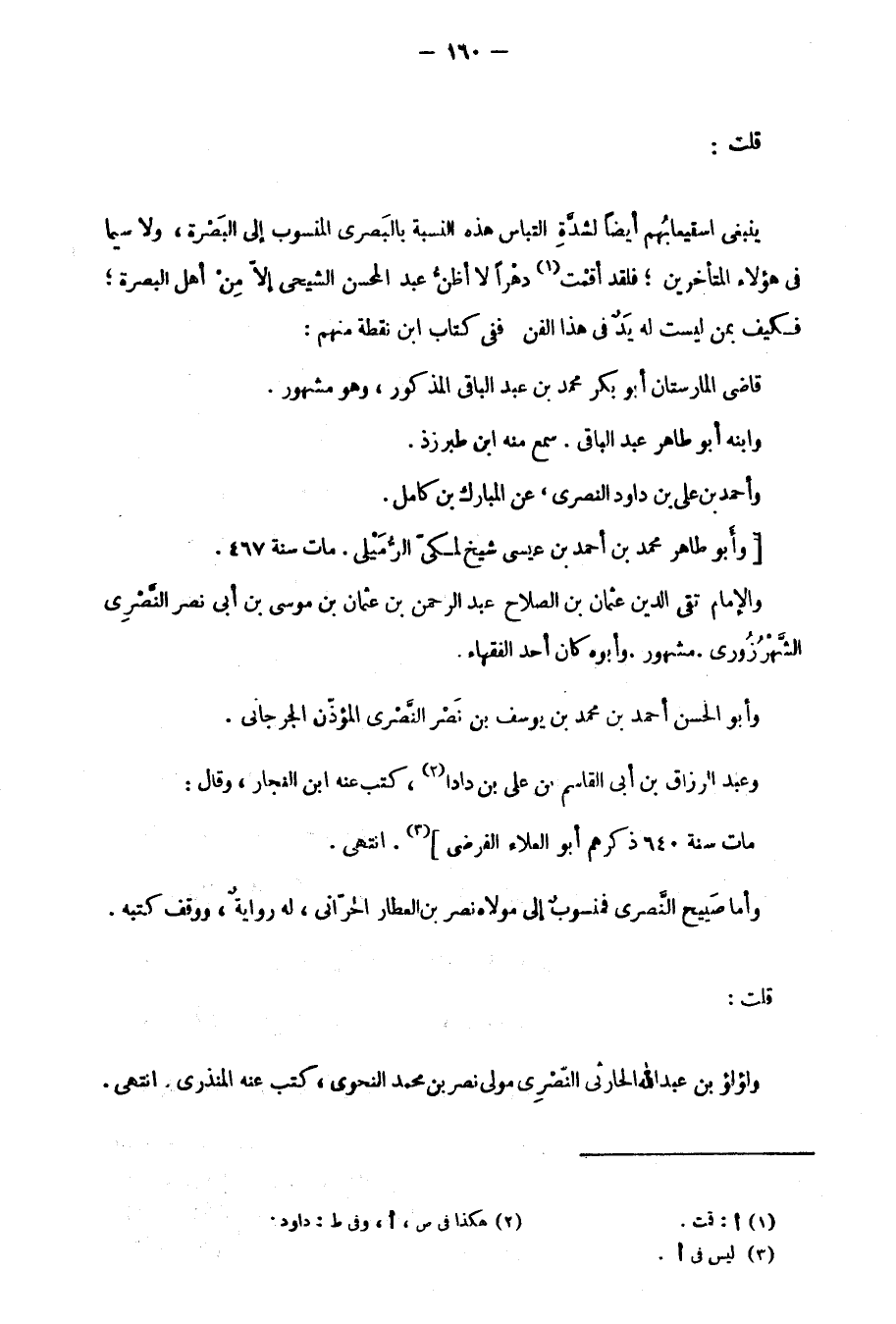 قلت: ينبغي استيعابُهم أيضاً لِشدَّة التباس هَذِهِ النسبة بالبَصري المنسوب إِلَى البَصْرة، ولا سيما فِي هؤلاء المتأخرين؛ فلقد أقمْت دهْرًا أظنُّ عبد المحسن الشيحي إِلاَّ مِنْ أهل البصرة؛ فكيف بمن ليست لَهُ يَدٌ فِي هَذَا الفن ففي كتاب ابن نقطة منهم: