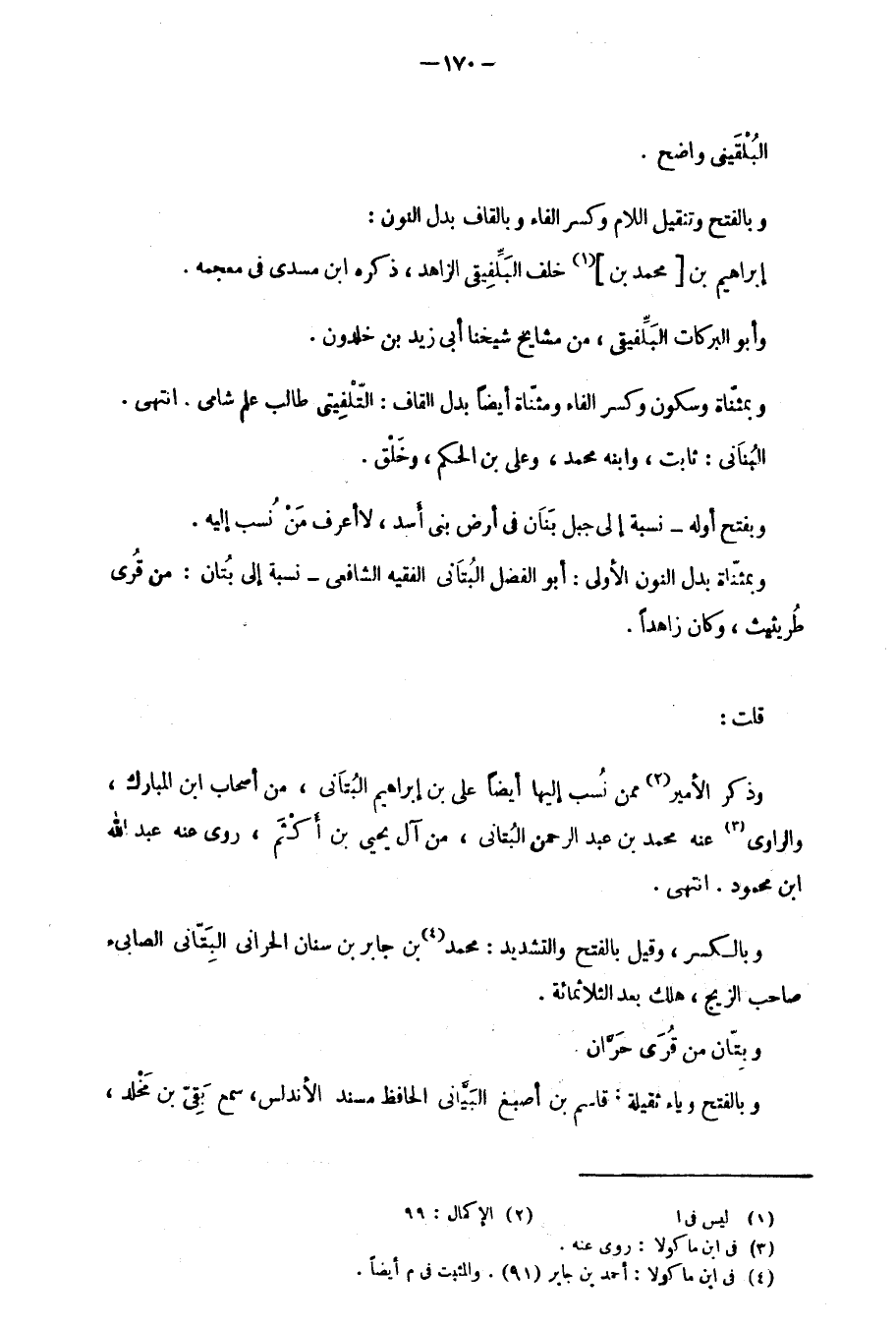قلت: وذكر الأمير ممن نُسب إليها أيضاً علي بن إبراهيم البُتَاني، من أصحاب ابن المبارك، والراوي عنه محمد بن عبد الرحمن البُتاني، من آل يحيى بن أَكْثَم، روى عنه عبد الله بن محمود. انتهى.
