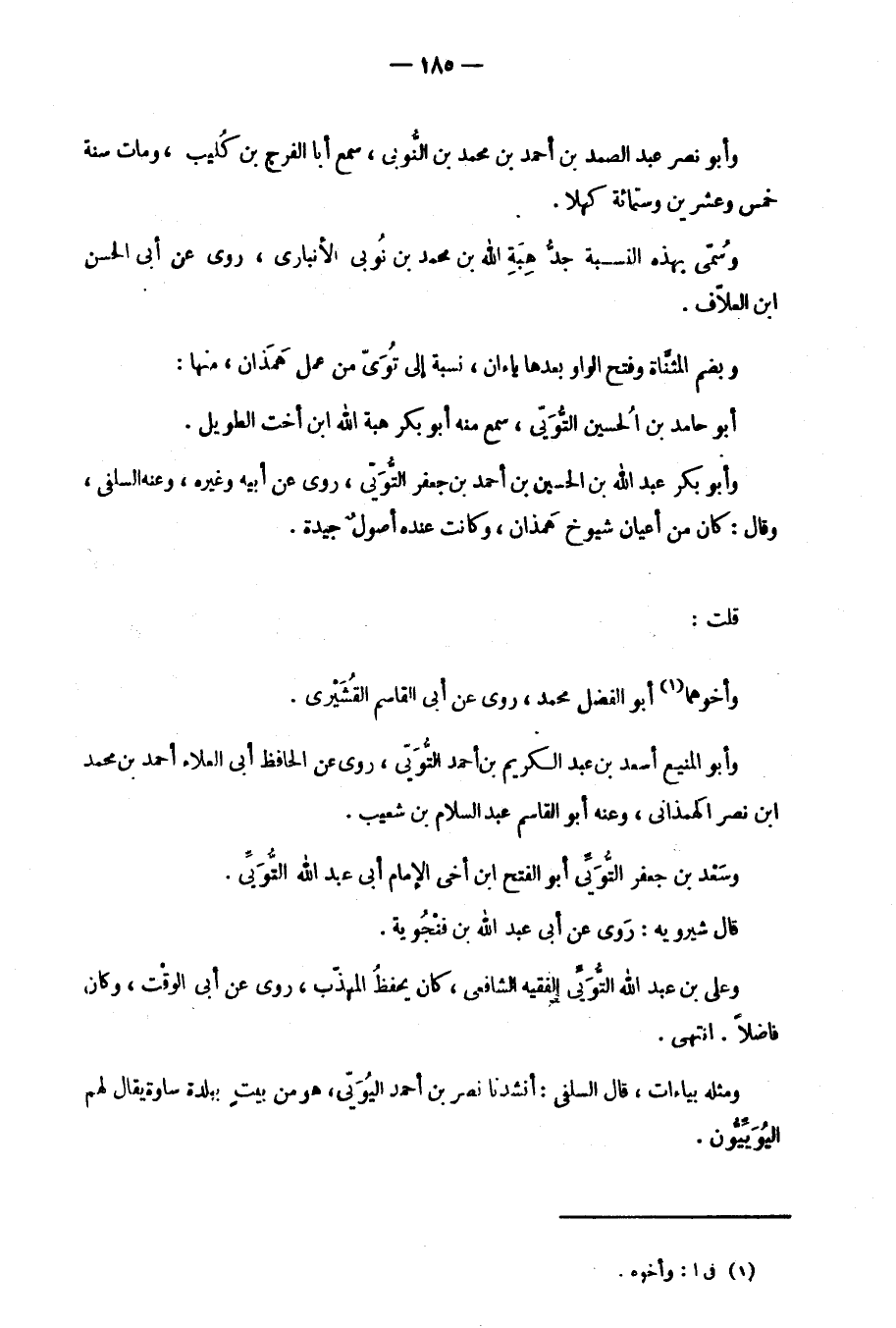 وأبو بكر عبد الله بن الحسين بن أحمد بن جعفر التُّوَيّي، روى عن أبيه وغيره، وعنه السلفي، وقال: كان من أعيان شيوخ هَمذان، وكانت عنده أصولٌ جيدة.