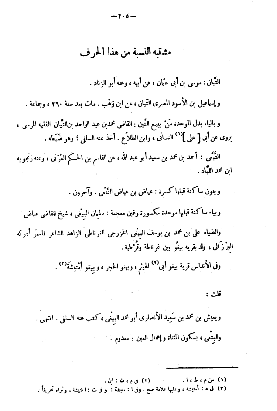 وبالياء بدل الموحدة مَنْ يبيع التِّين: القاضي محمد بن عبد الواحد بن التَّبان الفقيه المرسي، يروي عن أبي علي الغساني، وابن الطلاّع. أخذ عنه السلفي؛ وهو ضَبَطه.