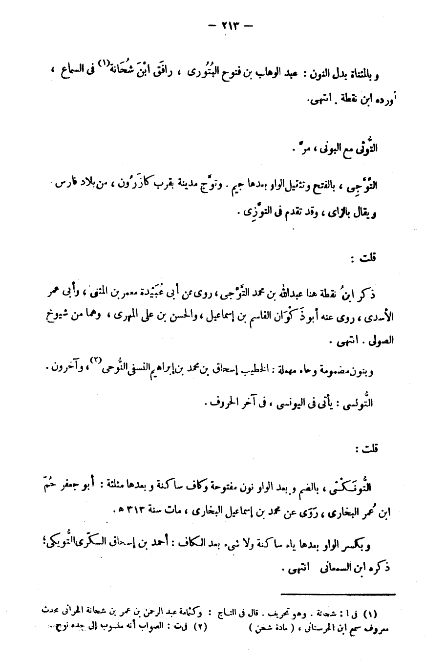 قلت: ذكر ابنُ نقطة هنا عبد الله بن محمد التَّوَّجي، روى عن أبي عُبَيْدة معمر بن المثنى، وأبي عمر الأسدي، روى عنه أبو ذَكْوَان القاسم بن إسماعيل، والحسن بن علي المهري، وهما من شيوخ الصولي. انتهى.