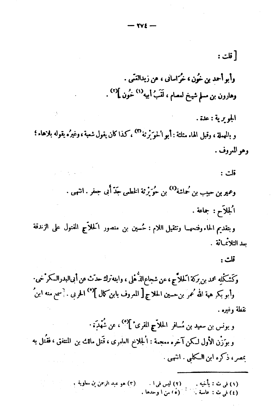 وبتقديم الحاء وفتحها وتثقيل اللام: حُسين بن منصور الحَلاّج المقتول عَلَى الزندقة بعد الثلاثمِئَة.
