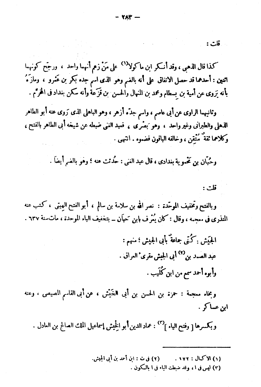 وثانيهما الراوي عن أبي عاصم، واسم حدّه أزهر، وهو الباهلي الذي رَوى عنه أبو الطاهر الذهبي والطبراني وغير واحد، وهو بَصْري، فعبد العني ضبطه عن شيخه أبي الطاهر بالفتح، وكلاهما ثقةٌ مُتْقِن، وخالفه الباقون فضموه. انتهى.