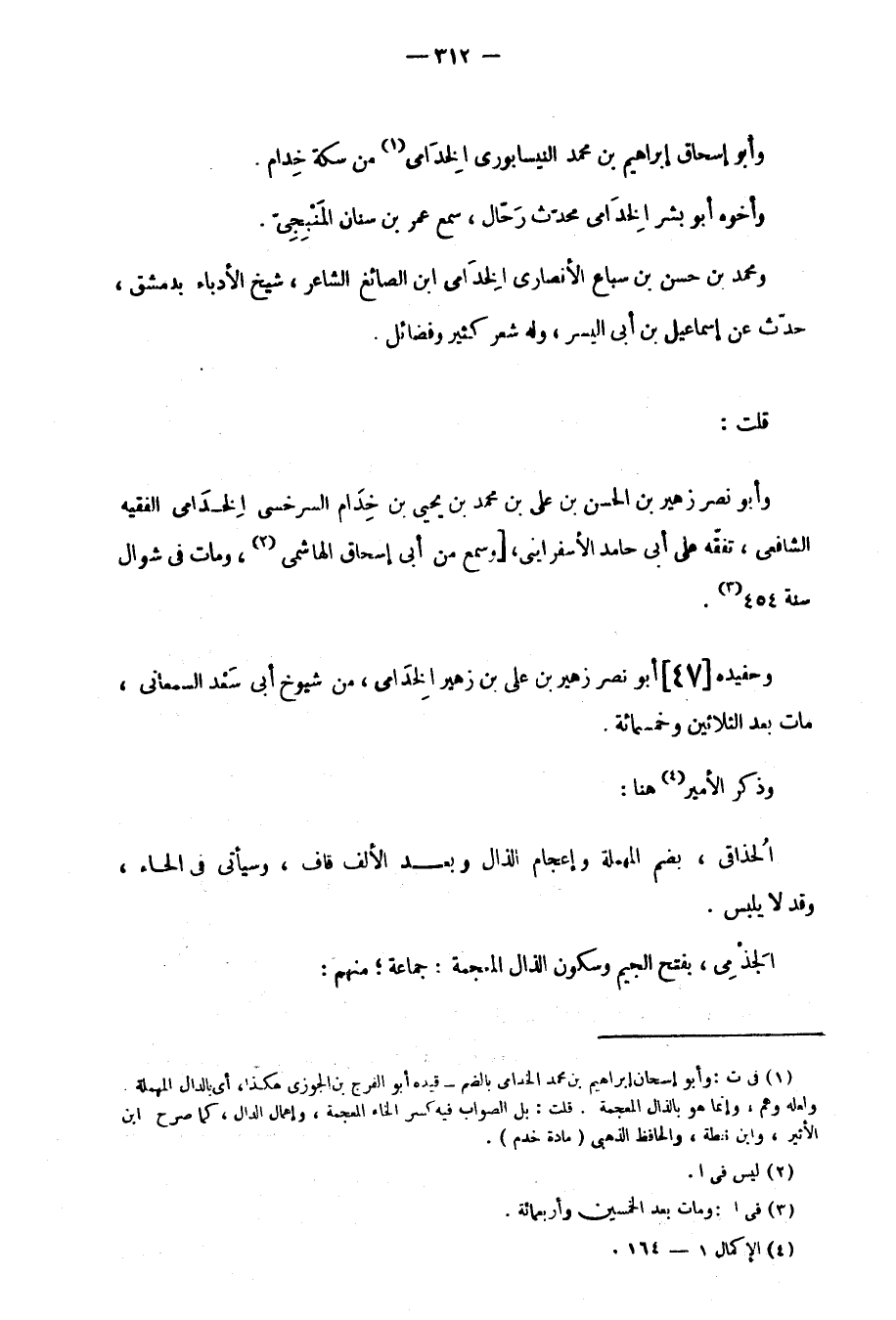 قلت: وأبو نصر زهير بن الحسن بن علي بن محمد بن يحيى بن خِدَام السرخسي الخِدَامي الفقيه الشافعي، تفقّه عَلَى أبي حامد الأسفرايني، وسمع من أبي إسحاق الهاشمي، ومات في شوال سنة 454.