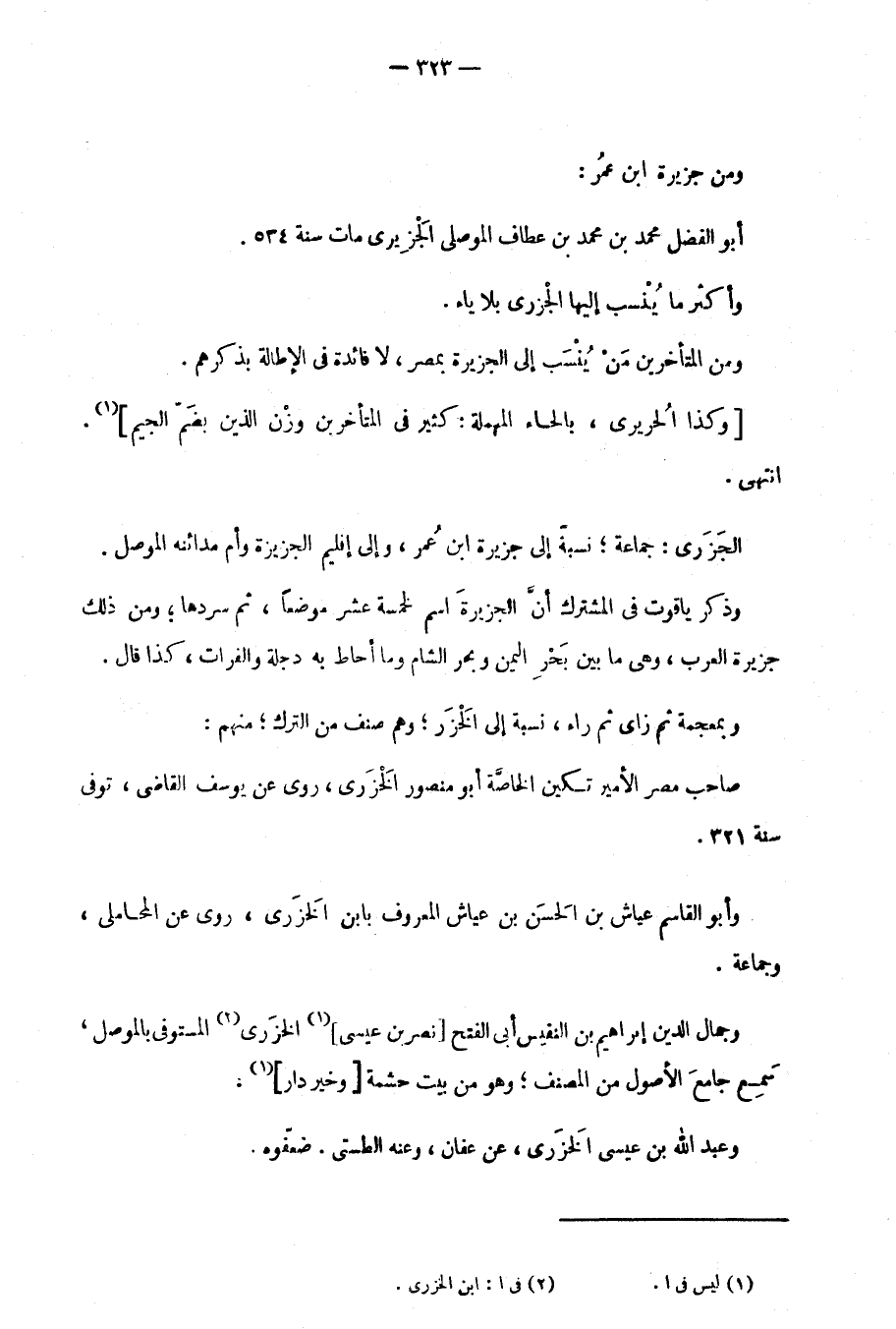 الجَزَري: جماعة؛ نسبةً إلى جزيرة ابن عُمر، وإلى إقليم الجزيرة وأم مدائنه الموصل.