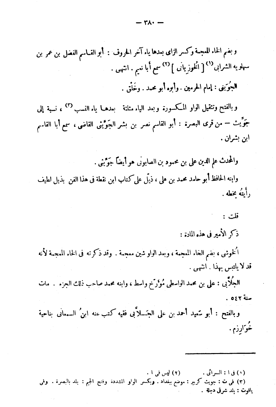 الجُوَيني: إمام الحرمين. وأبوه أبو محمد. وخَلْق.