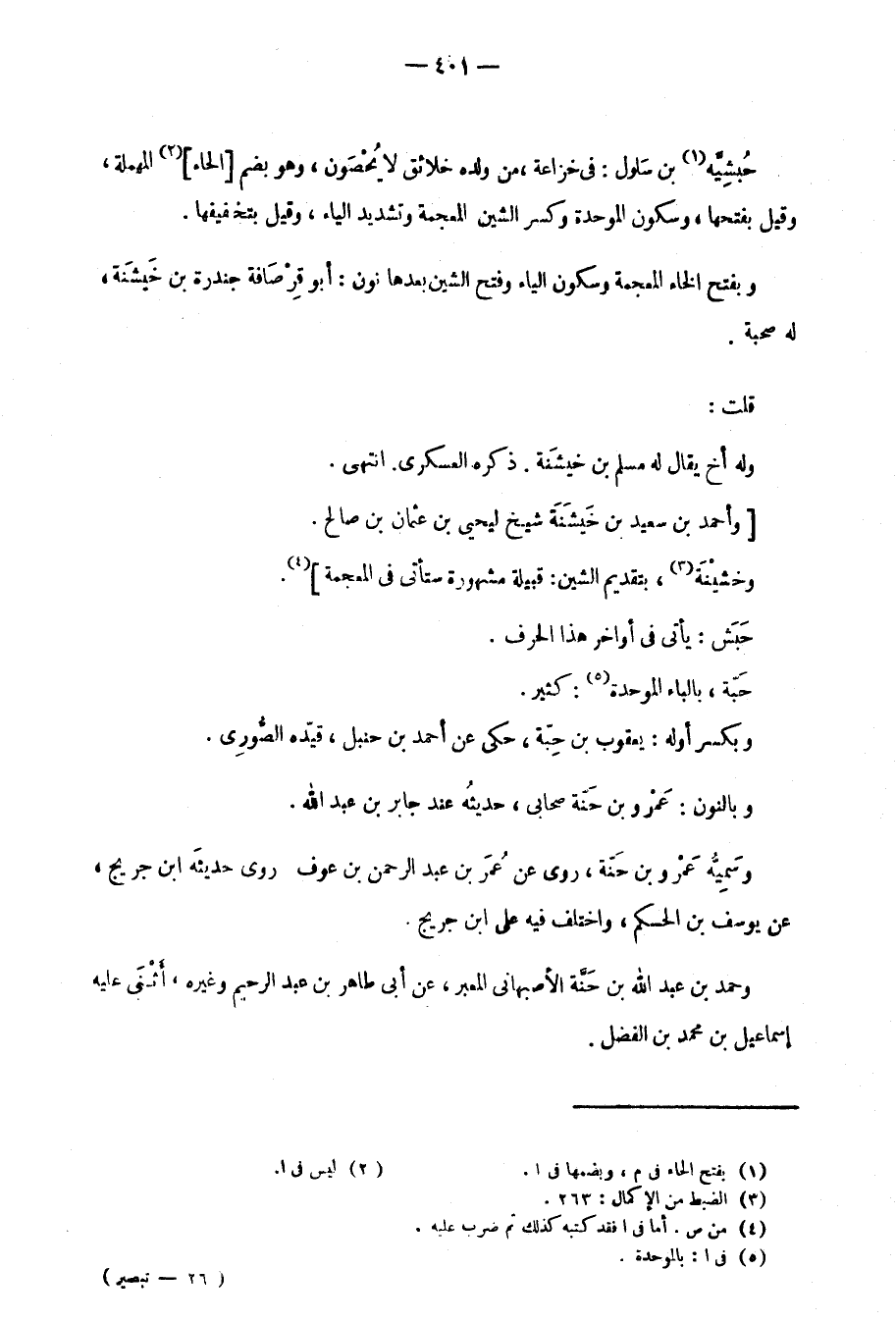 حُبِشَّية بن سَلول: في خزاعة، من ولده خلائق لا يُحْصَون، وهم بضم الحاء المهملة، وقِيل: بفتحها، وسكونا لموحدة وكسر الشين المعجمة وتشديد الياء، وقِيل: بتخفيفها.