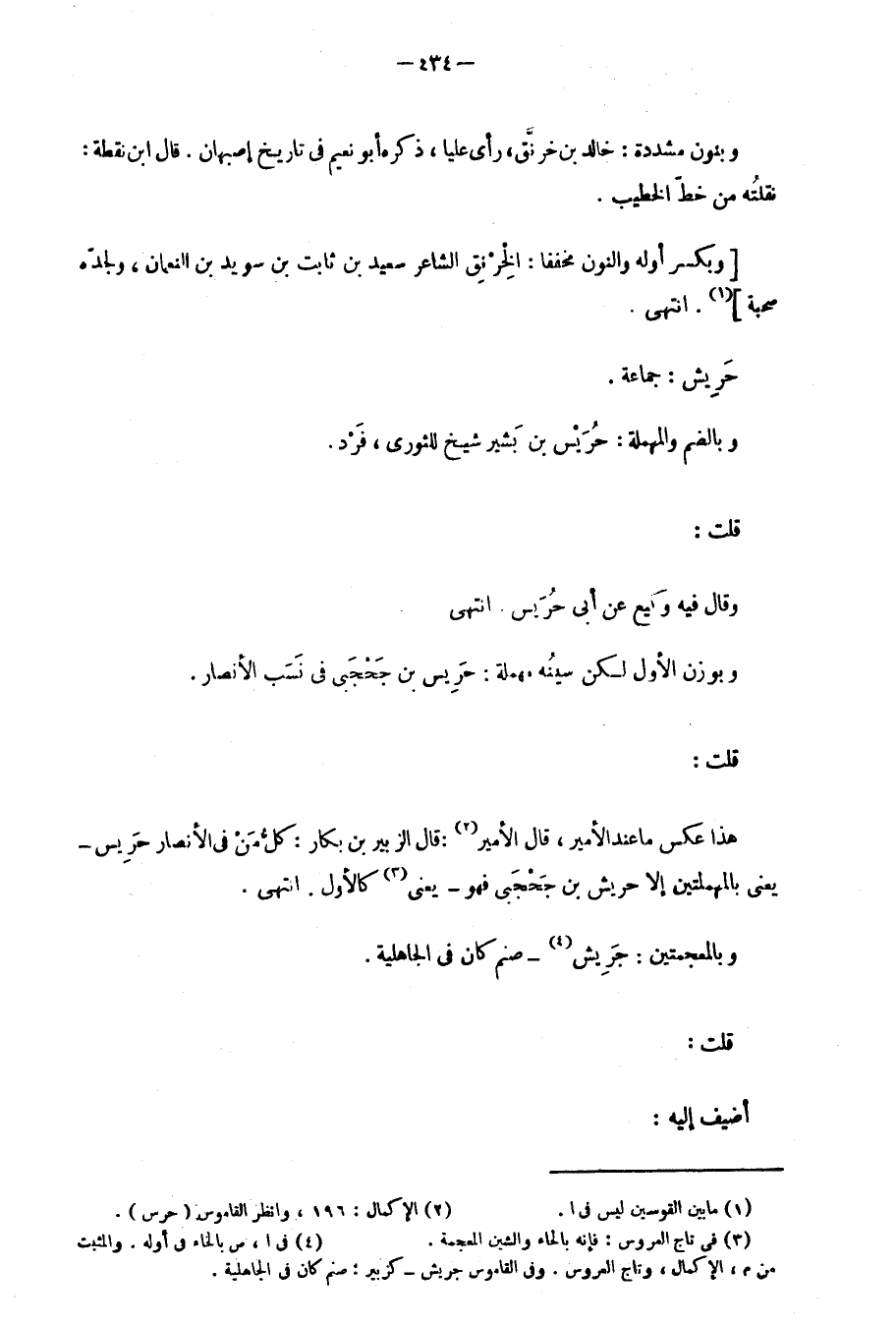 قلت: هذا عكس ما عند الأمير، قال الأمير: قال الزبير بن بكار: كلُّ مَنْ في الأنصار حَرِيس، يعني بالمهملتين إلا حريش بن جَحْجَبي فهو، يعني كالأول. انتهى.