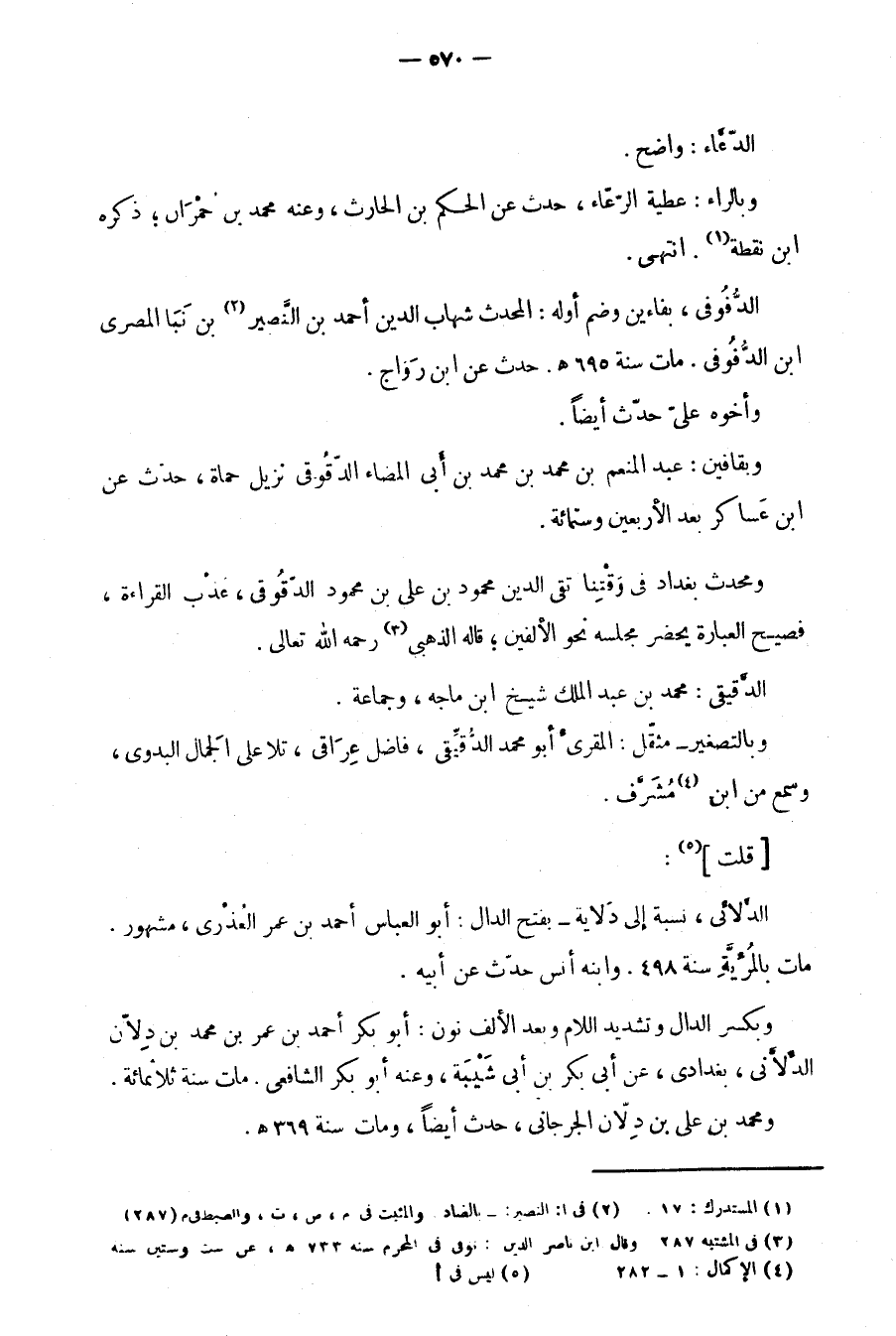 وبكسر الدال وتشديد اللام وبعد الألف نون: أبو بكر أحمد بن عمر بن محمد بن دلان الدلاني، بغدادي، عن أبي بكر بن أبي شيبة، وعنه أبو بكر الشافعي. مات سنة ثلاثمِئَة.
