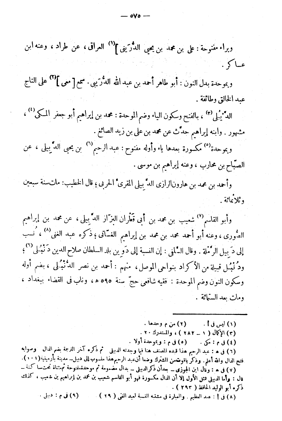 وأبو القاسم شعيب بن محمد بن أبي قطران البزاز الدبيلي، عن محمد بن إبراهيم الصوري، وعنه أبو أحمد محمد بن إبراهيم الغساني؛ ذكره عبد الغني، نسب إلى دبيل الرملة. وقال السلفي: إن النسبة إلى دوين بلد السلطان صلاح الدين دنبلي؛ ودنبل قبيلة من الأكراد بنواحي الموصل، أحمد بن نصر الدنبلي، بضم أوله وسكون النون وضم الموحدة: فقيه شافعي حج سنة 595 هـ، وناب في القضاء ببغداد، ومات بعد الستمِئَة.