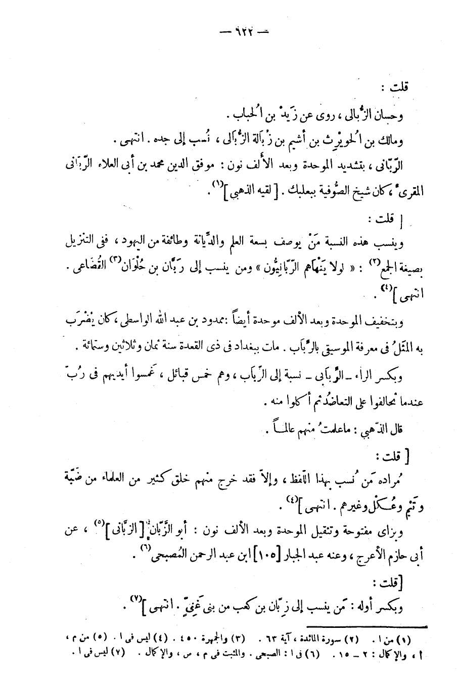 قلت: وينسب هذه النسبة من يوصف بسعة العلم والديانة وطائفة من اليهود، ففي التنزيل بصيغة الجمع: "ولا ينهاهم الربانيون" ومن ينسب إلى ربان بن حلوان القضاعي. انتهى.