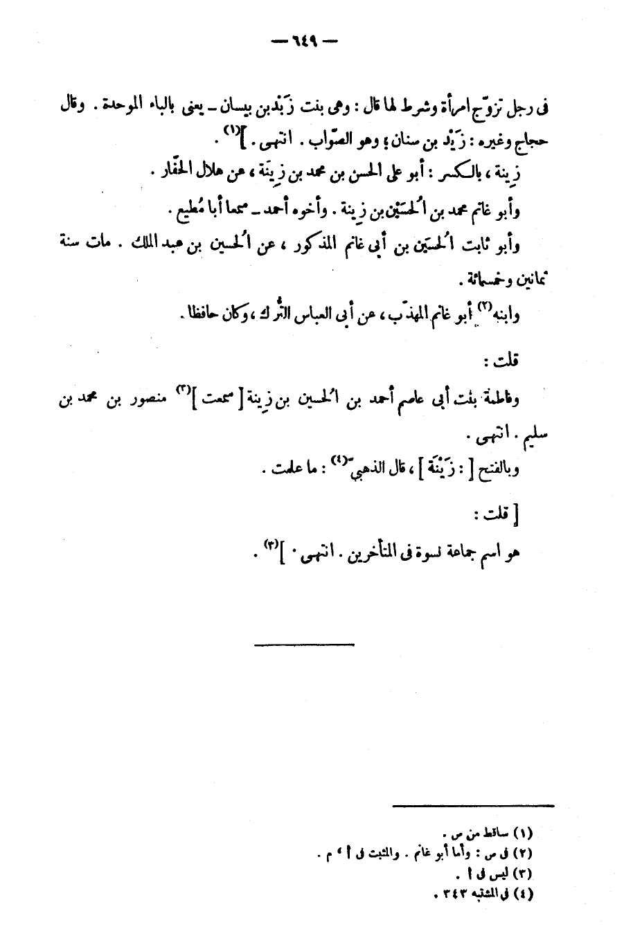 في رجل تزوج امرأة وشرط لها قال: وهي بنت زبد بن بيسان، يعني بالباء الموحدة. قال حجاج وغيره: زيد بن سنان؛ وهو الصواب. انتهى.
