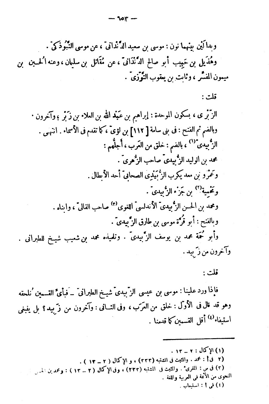 قلت: فإذا ورد علينا: موسى بن عيسى الزبيدي شيخ الطبراني، فبأي القسمين نلحقه وهو قد قال في الأول: خلق من العرب، وفي الثاني: وآخرون من زبيد? بل ينبغي استيفاء أقل القسمين كما قدمنا.