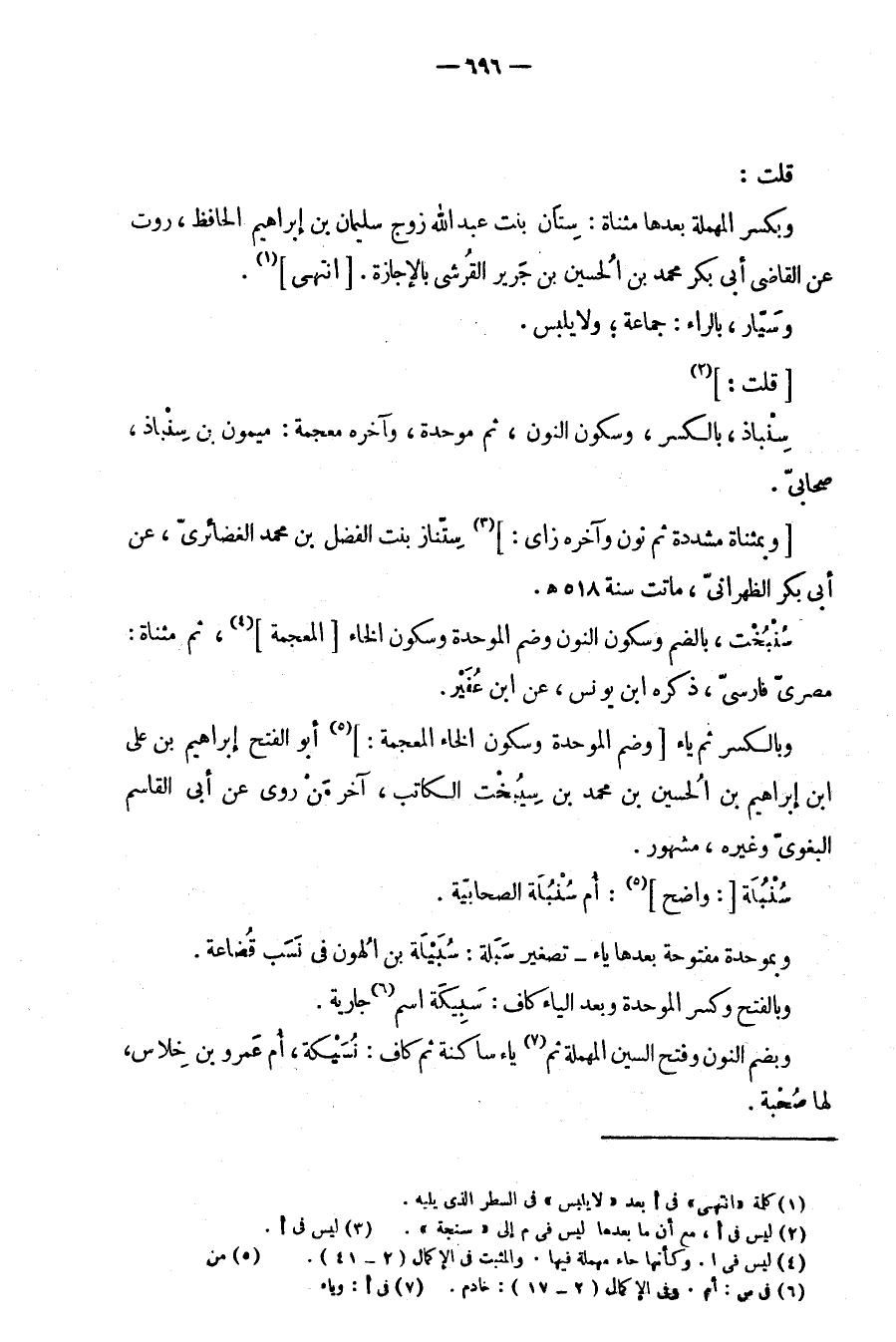 قلت: وبكسر المهملة بعدها مثناة: ستان بنت عبد الله زوج سليمان بن إبراهيم الحافظ، روت عن القاضي أبي بكر محمد بن الحسين بن جرير القرشي بالإجازة. انتهى.