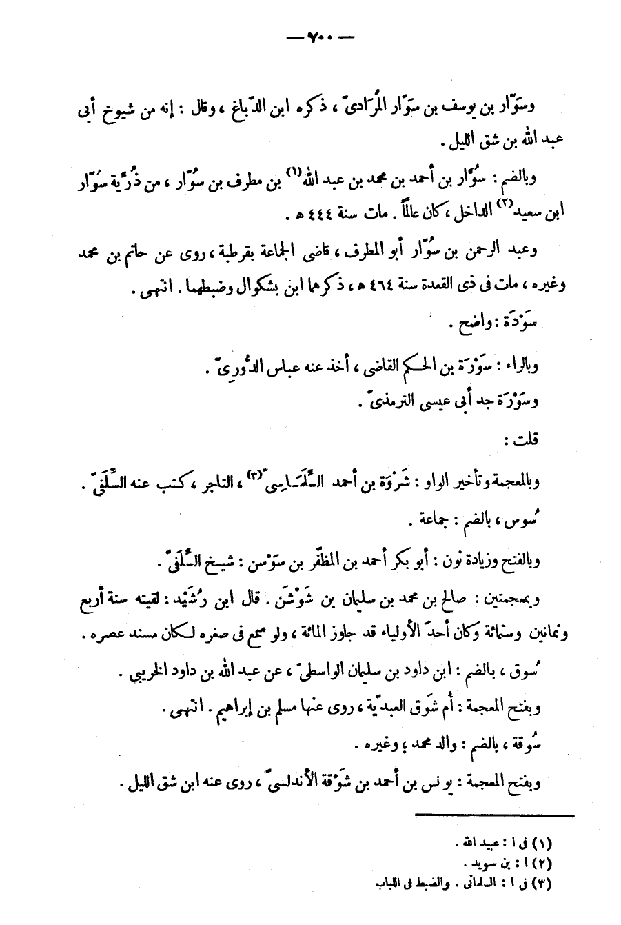 وعبد الرحمن بن سوار أبو المطرف، قاضي الجماعة بقرطبة، روى عن حاتم بن محمد وغيره، مات في ذي القعدة سنة 464 هـ، ذكرهما ابن بشكوال وضبطهما. انتهى.