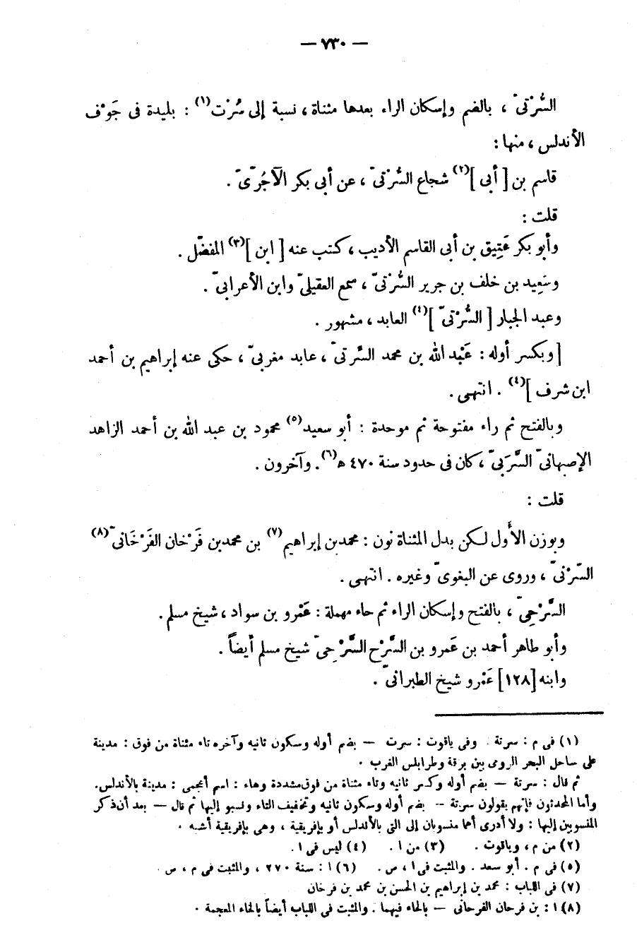 وبكسر أوله: عبد الله بن محمد السرتي، عابد مغربي، حكى عنه إبراهيم بن أحمد بن أشرف. انتهى.