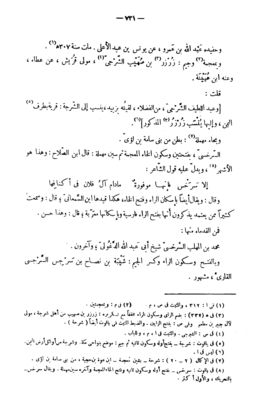 السرخسي، بفتحتين وسكون الخاء المعجمة ثم سين مهملة: قال ابن صلاح: وهذا هو الأشهر، ويدل عليه قول الشاعر: