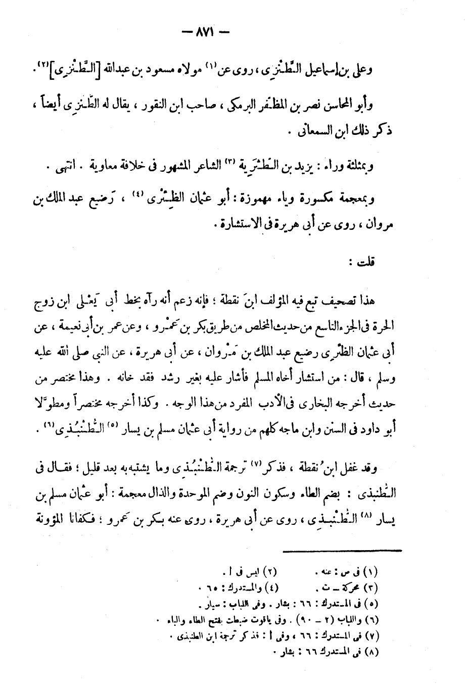 وقد غفل ابن نقطة، فذكر ترجمة الطنبذي وما يشتبه به بعد قليل؛ فقال في الطنبذي: بضم الطاء وسكون النون وضم الموحدة والذال معجمة: أبو عثمان مسلم بن يسار الطنبذي، روى عن أبي هريرة، روى عنه بكر بن عمرو؛ فكفانا المؤونة