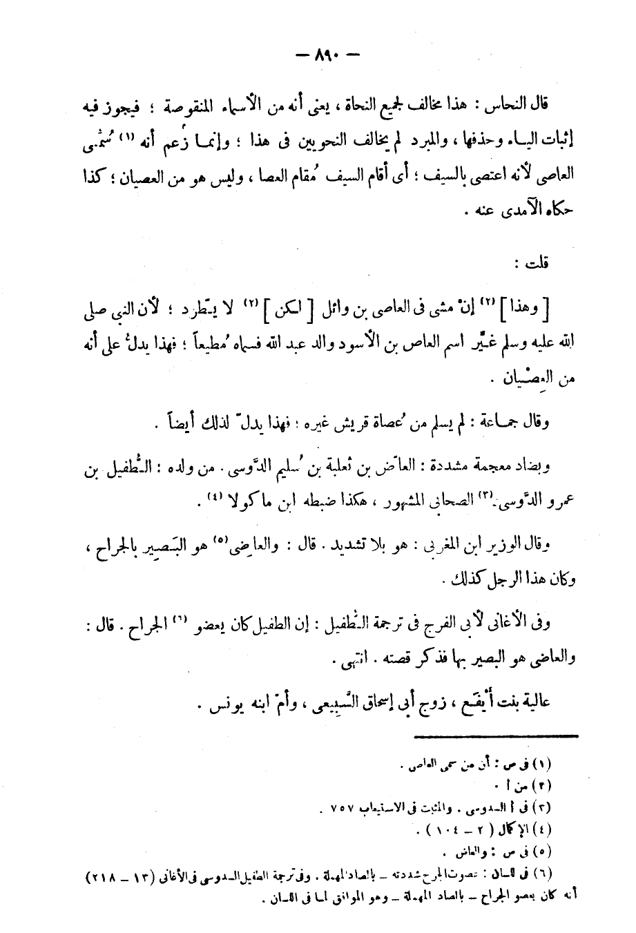 قال النحاس: هذا مخالف لجميع النحاة، يعني أنه من الأسماء المنقوصة؛ فيجوز فيه إثبات الياء وحذفها، والمبرد لم يخالف النحوين في هذا؛ وإنما زعم أنه سمي العاصي لأنه اعتصى بالسيف؛ أي أقام السيف مقام العصا، وليس هو من العصيان، كذا حكاه الآمدي عنه.
