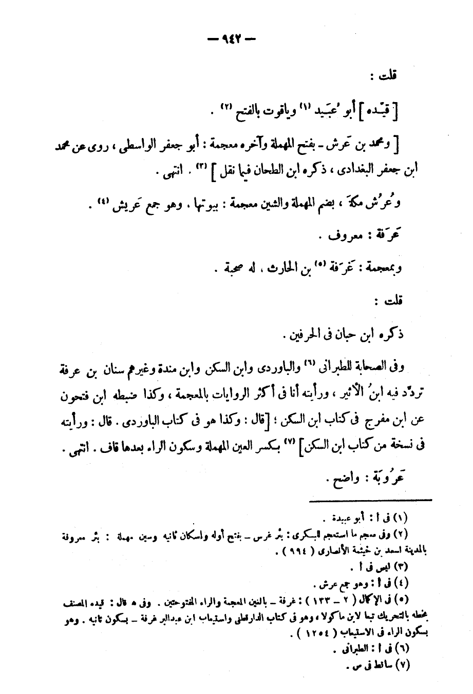 وفي الصحابة للطبراني والبارودي وابن السكن وابن مندة وغيرهم سنان بن عرفة تردد فيه ابن الأثير، ورأيته أنا في أكثر الروايات بالمعجمة، وذكا ضبطه ابن فتحون عن ابن مفرج في كتاب ابن السكن؛ قال: وكذا هو في كتاب البارودي. قال ورأيته في نسخة من كتاب ابن السكن بكسر العين المهملة وسكون الراء بعدها قاف. انتهى. في نسخة من كتاب ابن السكن بكسر العين المهملة وسكون الراء بعدها قاف. انتهى.