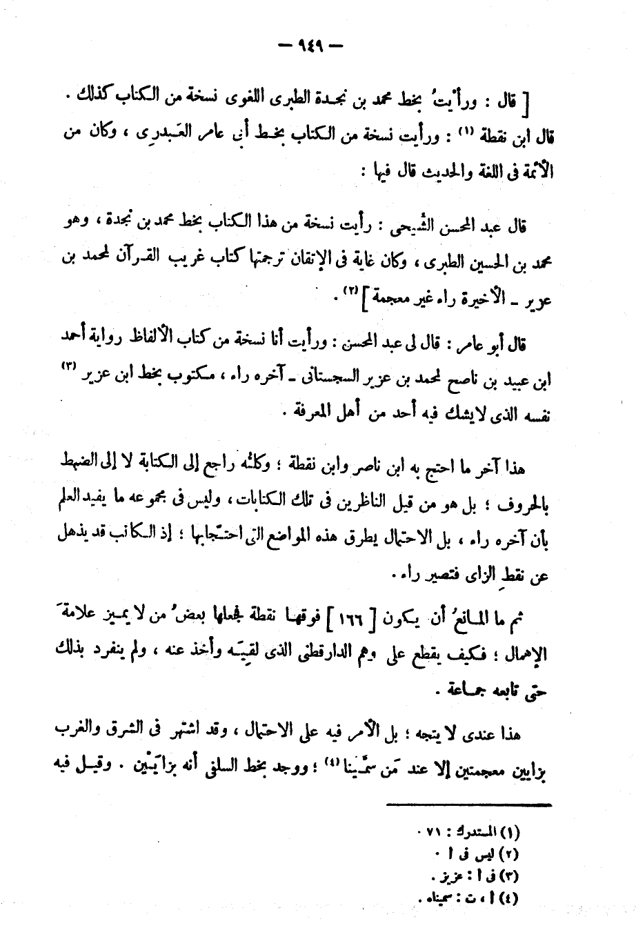 قال: ورأيت بخط محمد بن نجدة الطبري اللغوي نسخة من الكتاب كذلك. قال ابن نقطة: ورأيت نسخة من الكتاب أبي عامر العبدري، وكان من الأئمة في اللغة والحديث قال فيها: