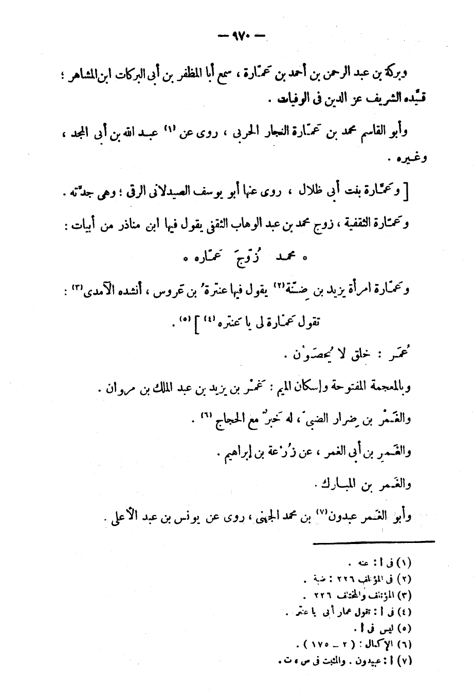وبركة بن عبد الرحمن بن أحمد بن عمارة، سمع أبا المظفر بن أبي البركات ابن المشاهر؛ قيده الشريف عز الدين في الوفيات.