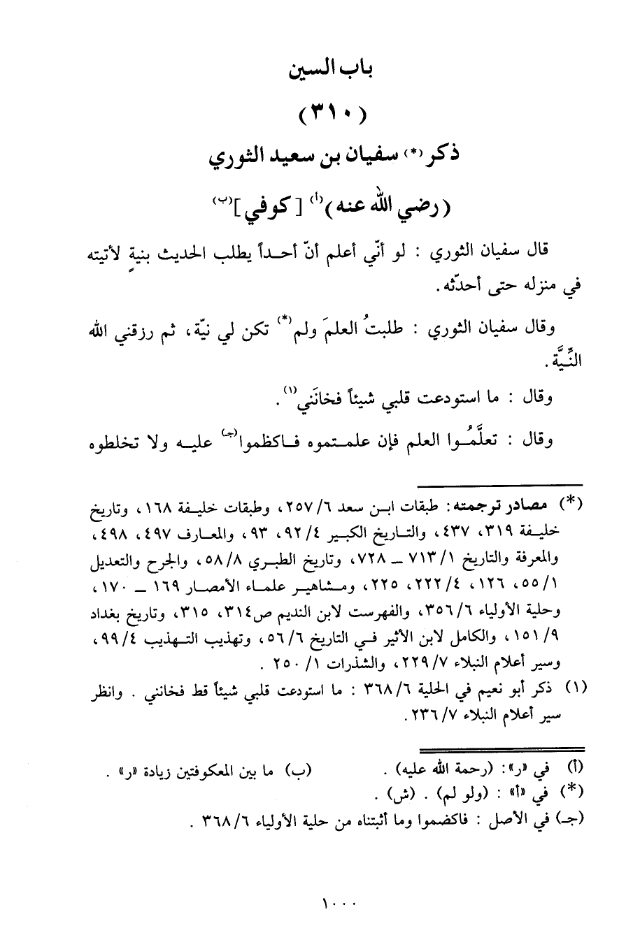 كُوفِيٌّ قَالَ سُفْيَانُ الثَّوْرِيّ لَوْ أَنِّي أَعْلَمُ أَنَّ أَحَدًا يَطْلُبُ الْحَدِيثَ بِنِيَّةٍ لَأَتَيْتُهُ فِي مَنْزِلِهِ حَتَّى أُحَدِّثَهُ.