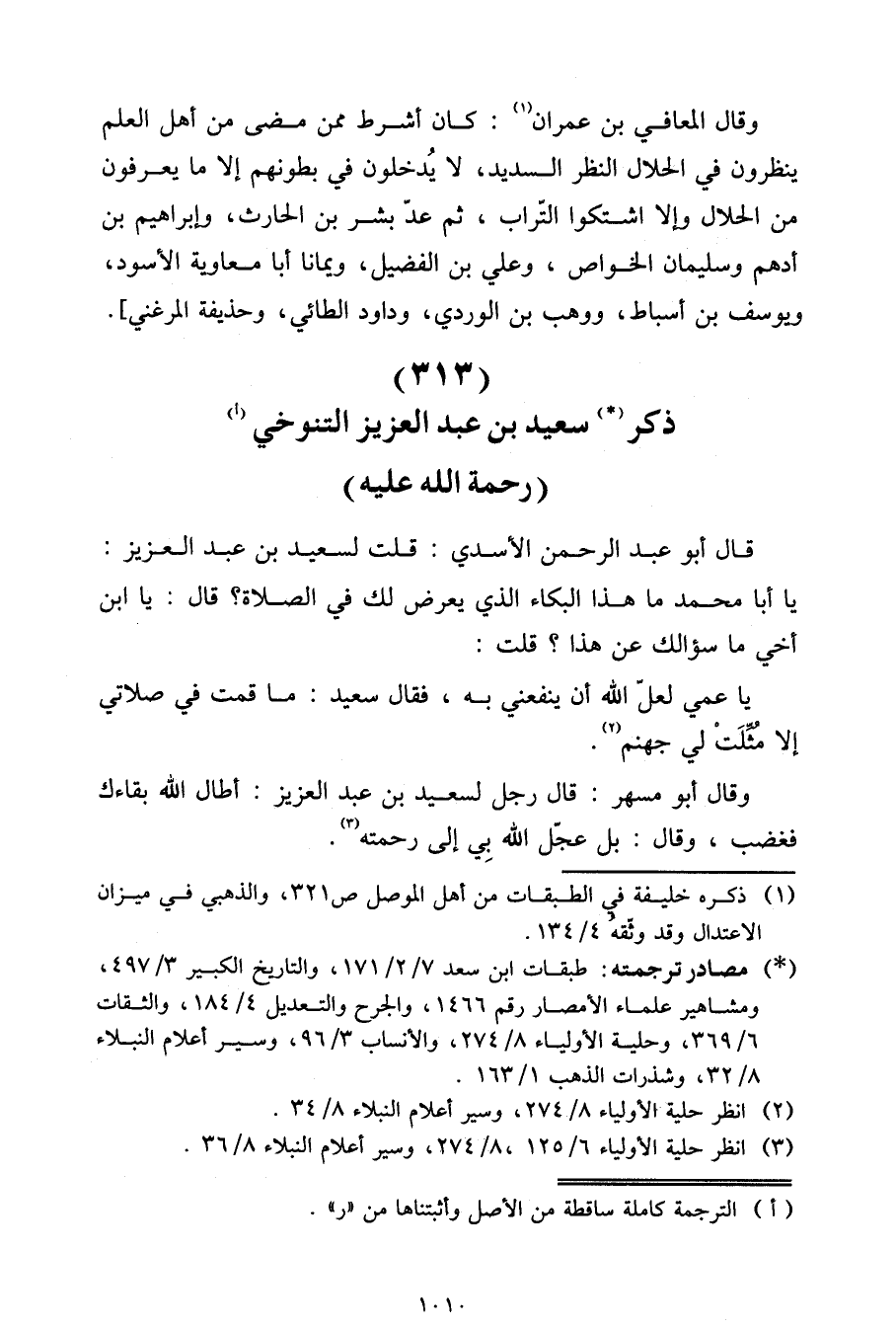 قَالَ أَبُو عَبْدِ الرَّحْمَنِ الْأَسَدِيِّ: قُلْتُ لِسَعِيدِ بْنِ عَبْدِ الْعَزِيزِ: يَا أَبَا مُحَمَّدٍ مَا هَذَا الْبُكَاءُ الَّذِي يَعْرِضُ لَكَ فِي الصَّلَاةِ؟ قَالَ: يَا ابْنَ أَخِي مَا سُؤَالُكَ عَنْ هَذَا؟ قُلْتُ: يَا عَمِّي لَعَلَّ اللَّهَ أَنْ يَنْفَعَنِي بِهِ، فَقَالَ سَعِيدٌ: مَا قُمْتُ فِي صَلَاتِي إِلَّا مُثِّلَتْ لِي جَهَنَّمُ.