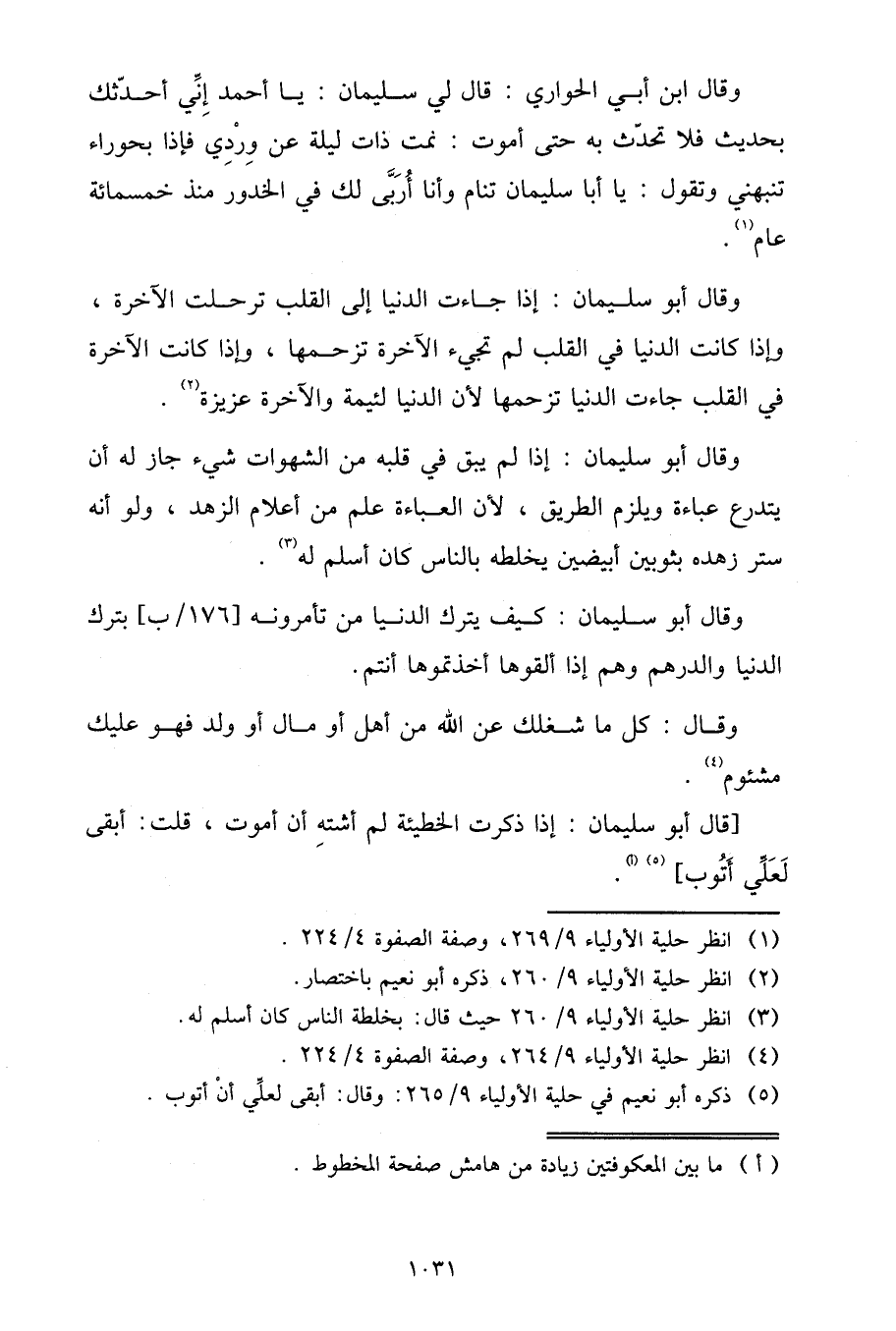 قَالَ أَبُو سُلَيْمَانَ: إِذَا ذَكَرْتُ الْخَطِيئَةَ لَمْ أَشْتَهِ أَنْ أَمُوتَ، قُلْتُ: أَبْقَى لَعَلِّي أَتُوبُ.