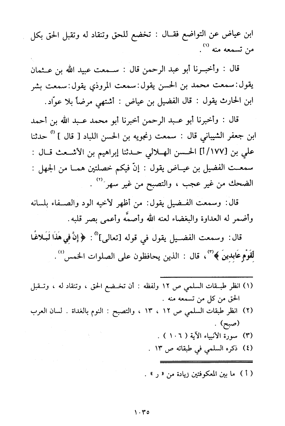 قَالَ: وَأَخْبَرَنَا أَبُو عَبْدِ الرَّحْمَنِ، أَخْبَرَنَا أَبُو مُحَمَّدٍ عَبْدُ اللَّهِ بْنُ أَحْمَدَ بْنِ جَعْفَرٍ الشَّيْبَانِيُّ , قَالَ: سَمِعْتُ زَنْجَوِيَّةَ بْنَ الْحَسَنِ اللَّبَّادُ , قَالَ: حَدَّثَنَا عَلِيُّ بْنُ الْحَسَنِ الْهِلَالِيُّ، حَدَّثَنَا إِبْرَاهِيمُ بْنُ الْأَشْعَثِ قَالَ: سَمِعْتُ الْفُضَيْلَ بْنَ عِيَاضٍ , يَقُولُ: " إِنَّ فِيكُمْ خَصْلَتَيْنِ هُمَا مِنَ الْجَهْلِ: الضَّحِكُ مِنْ غَيْرِ عَجَبٍ، وَالتَّصَبُّحُ مِنْ غَيْرِ سَهَرٍ ".
