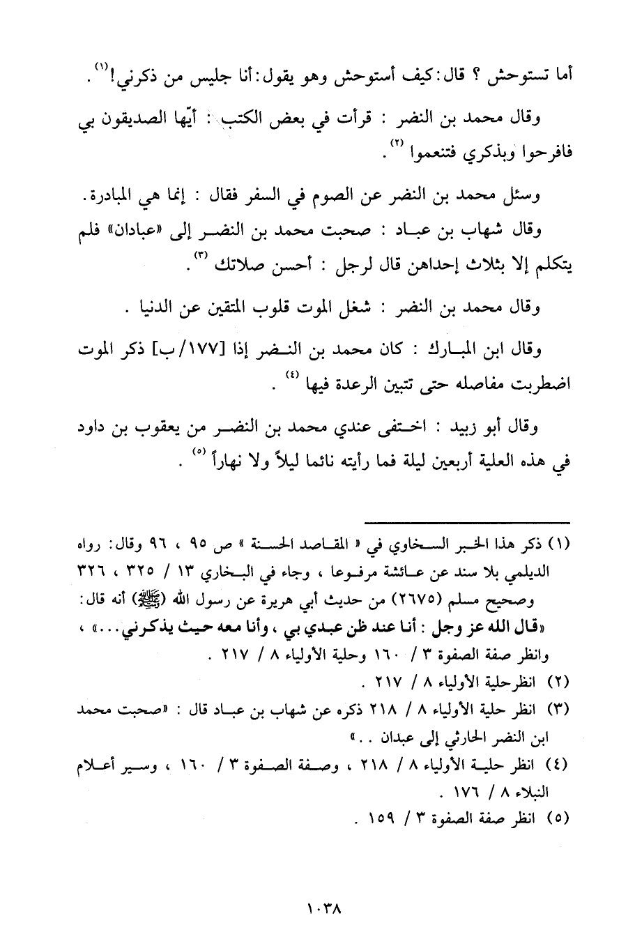 أَمَا تَسْتَوْحِشُ، قَالَ: كَيْفَ أَسْتَوْحِشُ وَهُوَ يَقُولُ: «أَنَا جَلِيسُ مَنْ ذَكَرَنِي» ! .