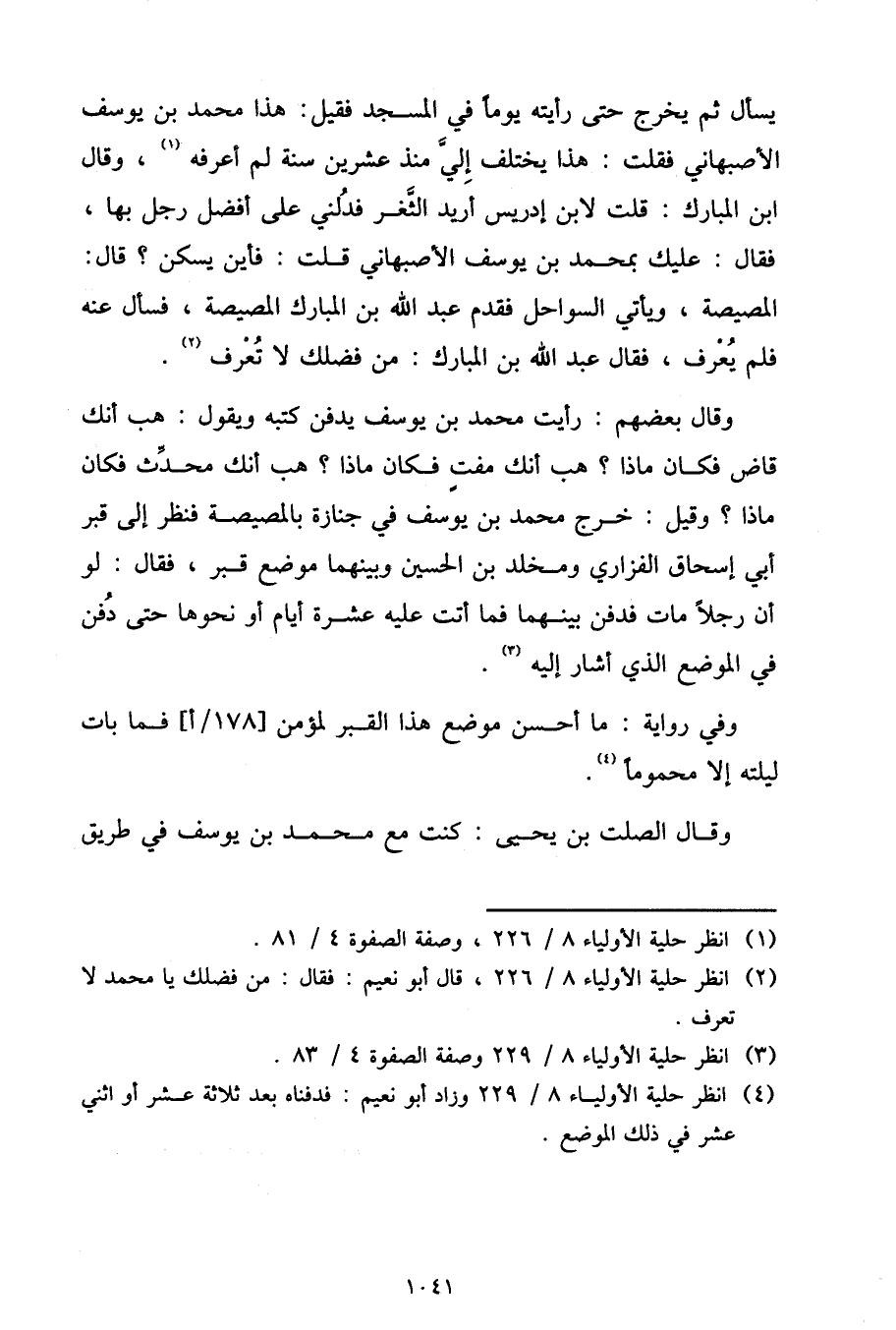 يَسْأَلُ ثُمَّ يَخْرُجُ، حَتَّى رَأَيْتُهُ يَوْمًا فِي الْمَسْجِدِ فَقِيلَ: هَذَا مُحَمَّدُ بْنُ يُوسُفَ الْأَصْبَهَانِيُّ , فَقُلْتُ: هَذَا يَخْتَلِفُ إِلَيَّ مُنْذُ عِشْرِينَ وَقَالَ ابْنُ الْمُبَارَكِ قُلْتُ لِابْنِ إِدْرِيسَ أُرِيدُ الثَّغْرَ فَدُلَّنِي عَلَى أَفْضَلِ رَجُلٍ بِهَا، فَقَالَ: عَلَيْكَ بِمُحَمَّدِ بْنِ يُوسُفَ الْأَصْبَهَانِيِّ , قُلْتُ: فَأَيْنَ يَسْكُنُ؟ قَالَ: الْمِصِّيصَةَ، وَيَأْتِي السَّوَاحِلَ فقدم عبد الله بن المبارك المصيصة، فسأل عنه فلم يعرف فقال عبد الله بن المبارك من فضلك لَا تُعْرَفُ.