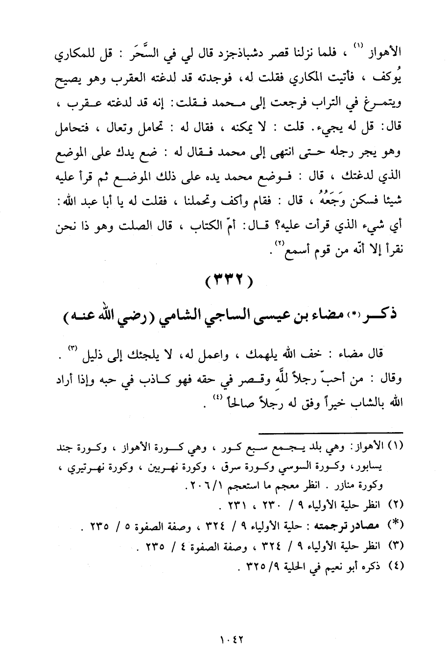 الْأَهْوَازِ، فَلَمَّا نَزَلْنَا قَصْرَ دَشْبَاذَجَزْدَ , قَالَ: لِي فِي السَّحَرِ قُلْ لِلْمُكَارِيِّ يُوكِفْ، فَأَتَيْتُ الْمُكَارِيَّ , فَقُلْتُ لَهُ، فَوَجَدْتُهُ قَدْ لَدَغَتْهُ الْعَقْرَبُ وَهُوَ يَصِيحُ وَيَتَمَرَّغُ فِي التُّرَابِ، فَرَجَعْتُ إِلَى مُحَمَّدٍ , فَقُلْتُ: إِنَّهُ قَدْ لَدَغَتْهُ عَقْرَبٌ، قَالَ: قُلْ لَهُ: يَجِيءُ، قُلْتُ: لَا يُمْكِنُهُ، فَقَالَ لَهُ: تَحَامَلْ وَتَعَالَ، فَتَحَامَلَ وَهُوَ يَجُرُّ رِجْلَهُ حَتَّى انْتَهَى إِلَى مُحَمَّدٍ , فَقَالَ لَهُ: ضَعْ يَدَكَ عَلَى الْمَوْضِعِ الَّذِي لَدَغَتْكَ، قَالَ: فَوَضَعَ مُحَمَّدٌ يَدَهُ عَلَى ذَلِكَ الْمَوْضِعِ ثُمَّ قَرَأَ عَلَيْهِ شَيْئًا فَسَكَنَ وَجَعُهُ، قَالَ: فَقَامَ وَأَكَفَّ وَتَحَمَّلْنَا، فقلت له يا أبا عبد الله أي شيء الذي قَرَأْتَ عَلَيْهِ؟ قَالَ: أَمُّ الْكِتَابِ، قَالَ الصَّلْتُ: وَهُوَ ذَا نَحْنُ نَقْرَأُ إِلَّا أَنَّهُ مِنْ قَوْمٍ أَسْمَعَ.