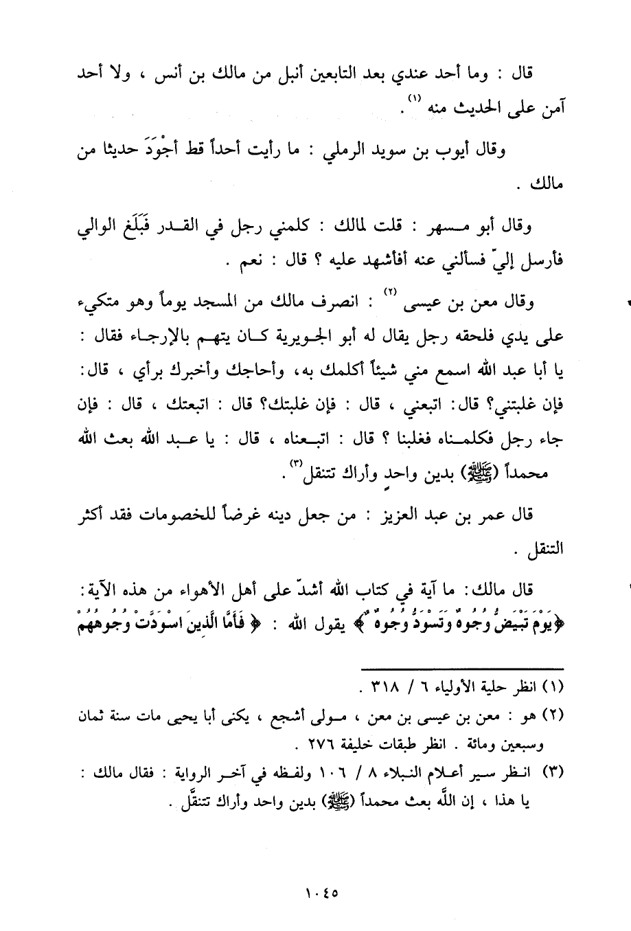 قَالَ مَالِكٌ مَا آيَةٌ فِي كِتَابِ اللَّهِ أَشَدُّ عَلَى أَهْلِ الْأَهْوَاءِ مِنْ هَذِهِ الْآيَةِ: {يَوْمَ تَبْيَضُّ وُجُوهٌ وَتَسْوَدُّ وُجُوهٌ} [آل عمران: ١٠٦] .