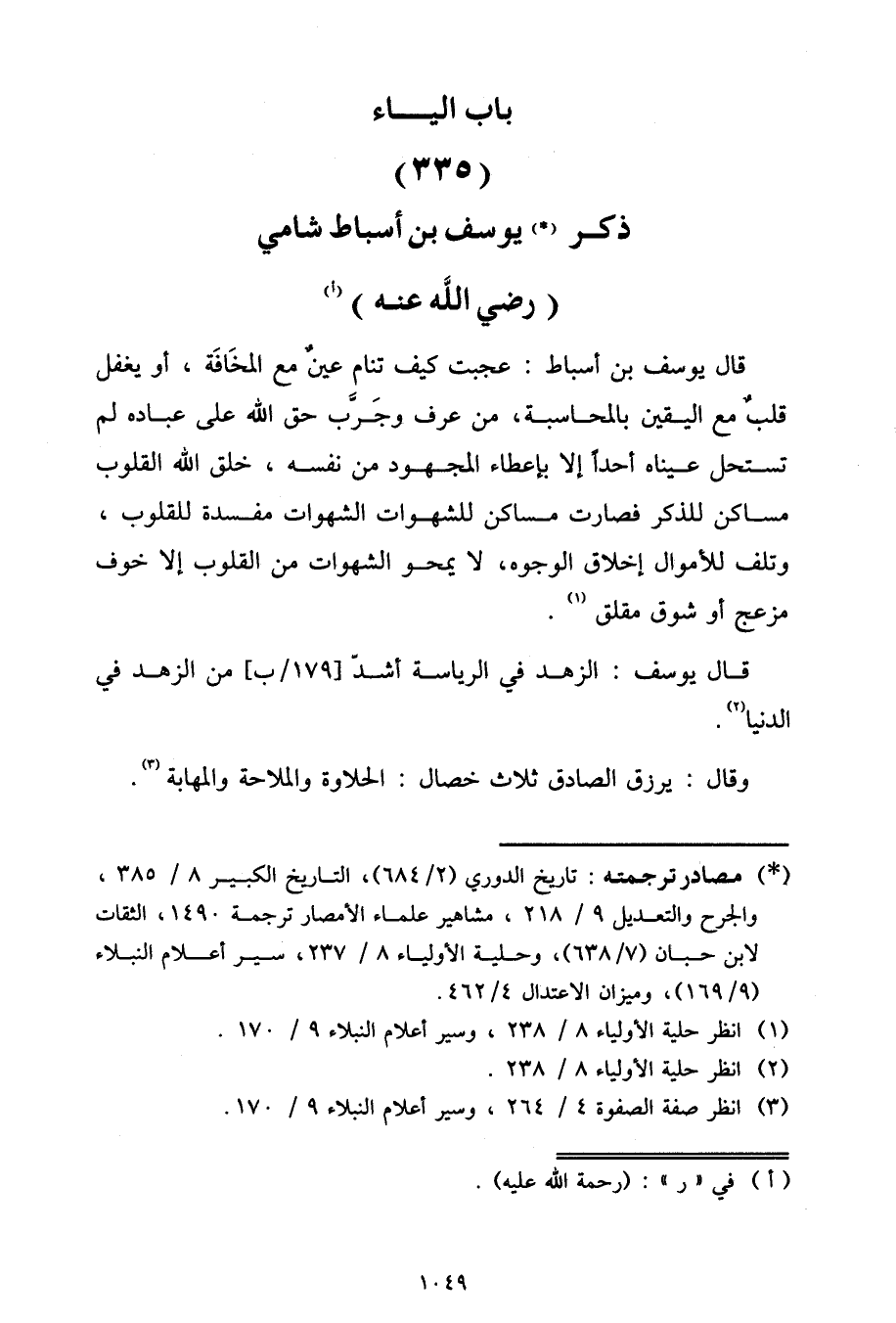 ذِكْرُ يُوسُفَ بْنِ أَسْبَاطٍ شَامِيٌّ رَضِيَ اللَّهُ عَنْهُ